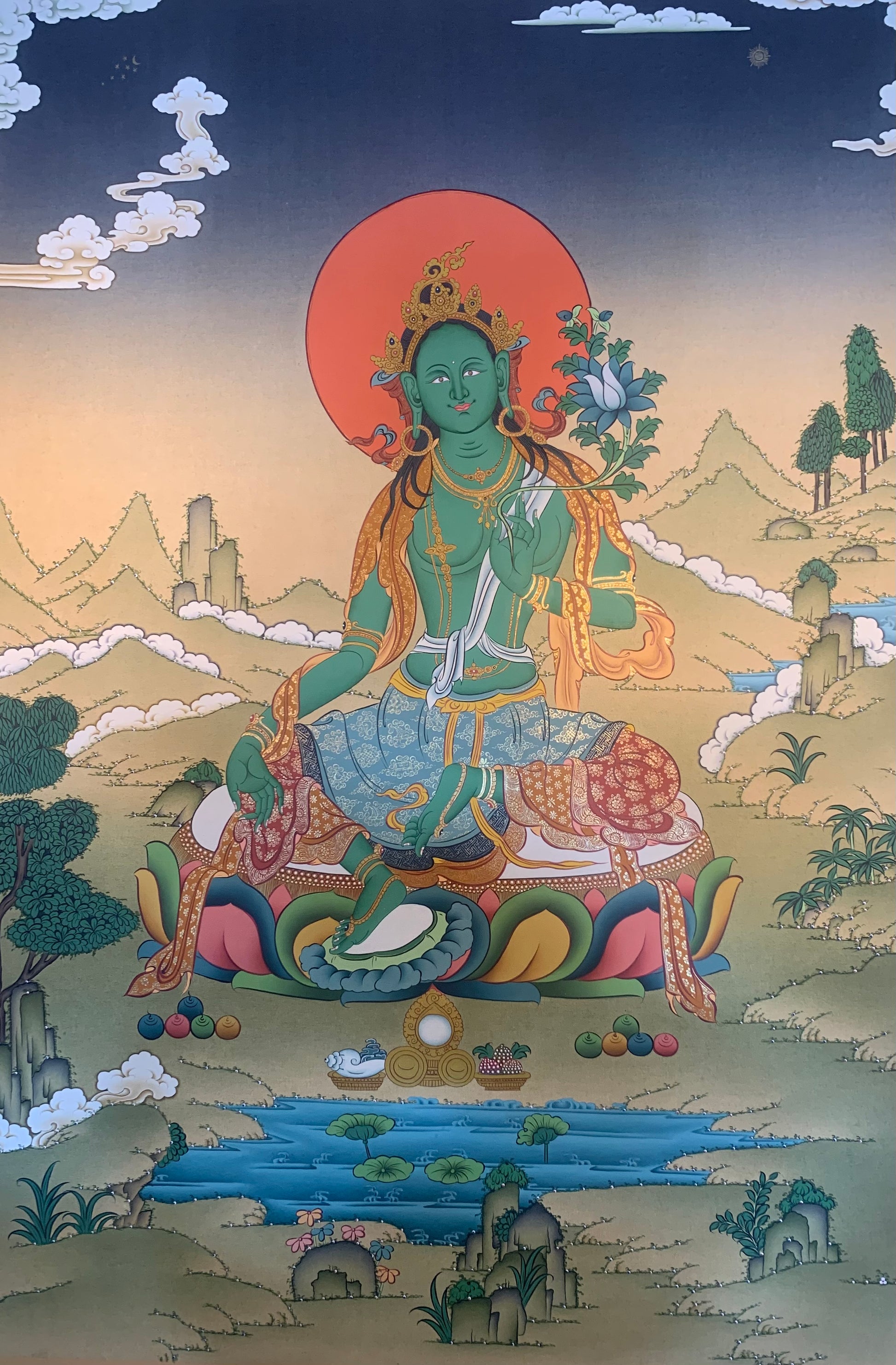 This beautiful hand painted Tibetan thangka painting depicts Green Tara སྒྲོལ་ལྗང་. Green Tara is regarded as the mother of all Bodhisattvas, a lover of all sentient beings. She is associated with enlightened activity, helping people pass beyond earthly existence. Green Tara grants refuge from all things which may obstruct, or cause trouble. She also embodies many qualities of the ‘feminine’, known as the mother of mercy and compassion, giving relief from bad karma.