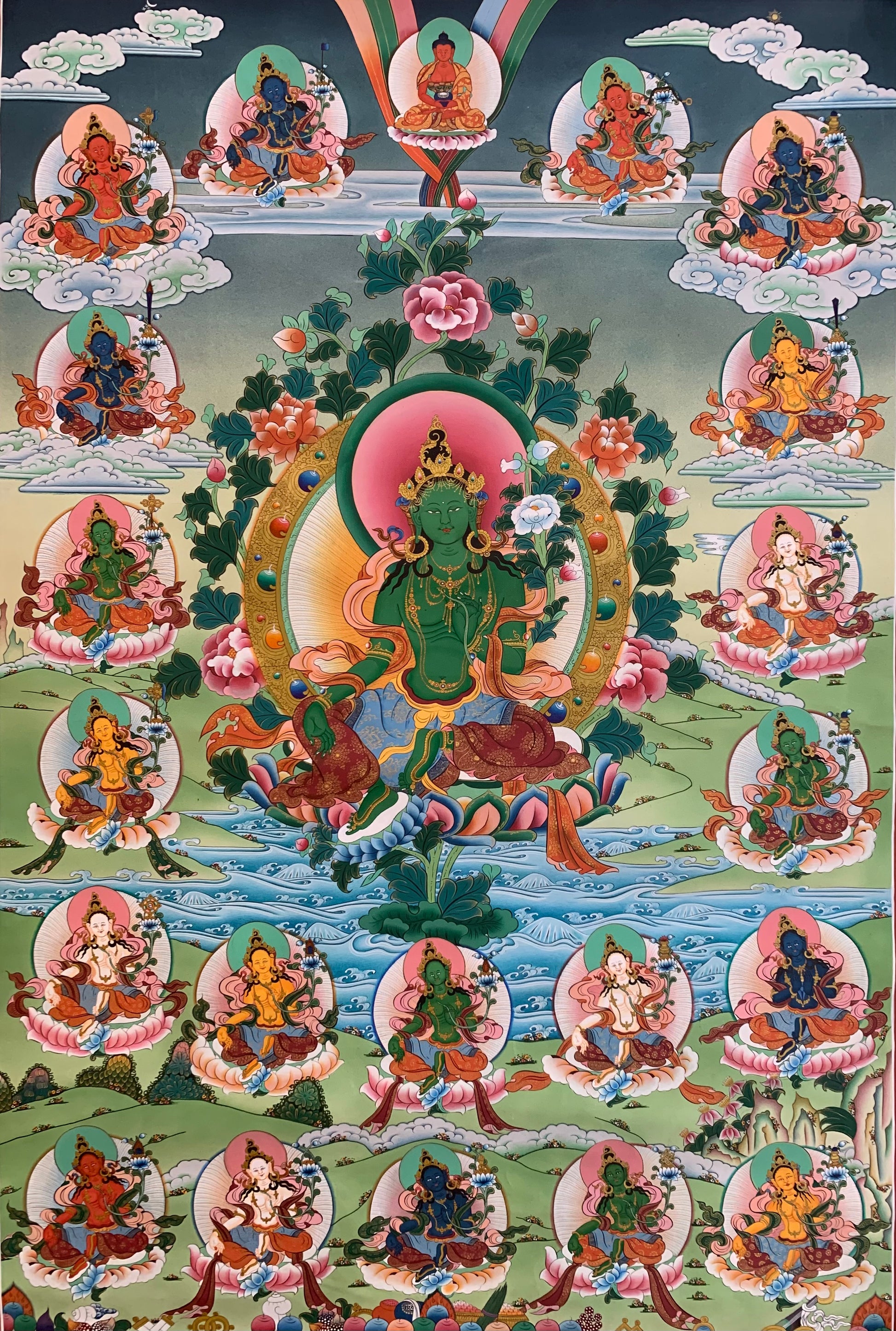 This beautiful hand-painted Tibetan thangka painting depicts the 21 Taras with Green Tara སྒྲོལ་ལྗང་། in the center.