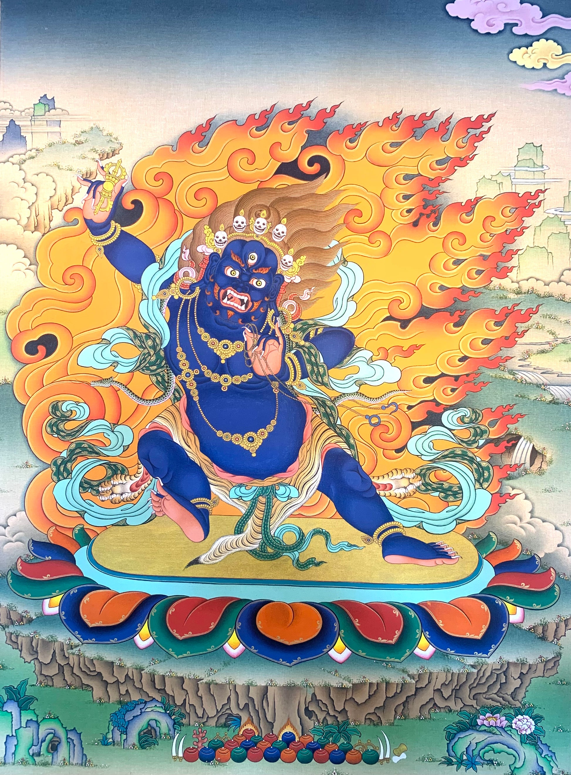 This beautiful hand painted Tibetan thangka painting depicts Vajrapani ཕྱག་ན་རྡོ་རྗེ་. Vajrapani is one of the eight great bodhisattvas and symbolizes the power of the Buddha.