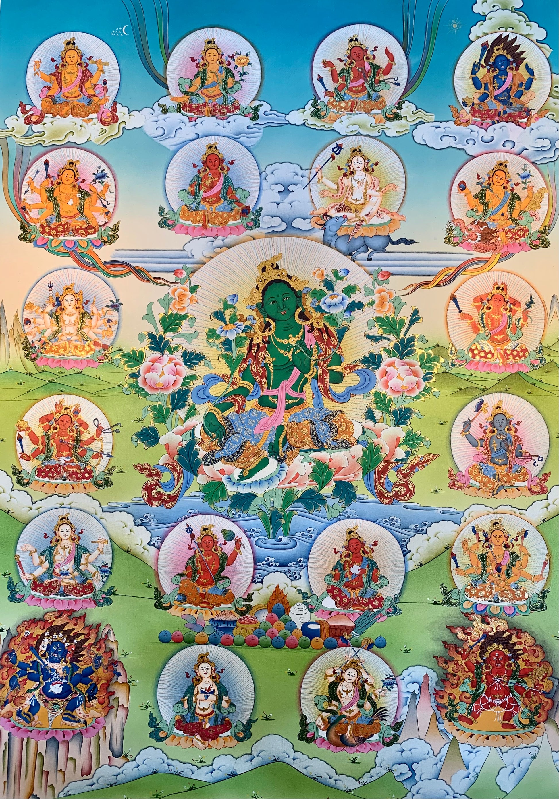 This beautiful hand-painted Tibetan thangka painting depicts the 21 Taras with Green Tara in the center. The 21 Taras systems come from the 'Twenty-One Praises of Tara' spoken by the Buddha Samantabhadra. One deception of Tara for each verse of the tantra text. There are 5 different traditions of the 21 Taras and the manner in which they are painted. The most common tradition in Tibetan thangka paintings is that of Atisha.