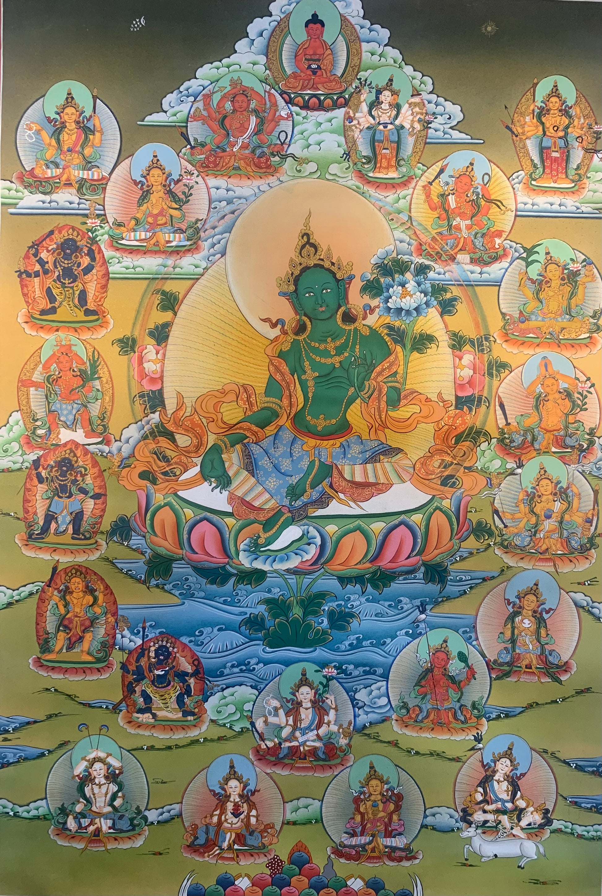 This beautiful hand-painted Tibetan thangka painting depicts the 21 Taras with Green Tara in the center. The 21 Taras systems come from the 'Twenty-One Praises of Tara' spoken by the Buddha Samantabhadra. One deception of Tara for each verse of the tantra text. There are 5 different traditions of the 21 Taras and the manner in which they are painted. The most common tradition in Tibetan thangka paintings is that of Atisha.
