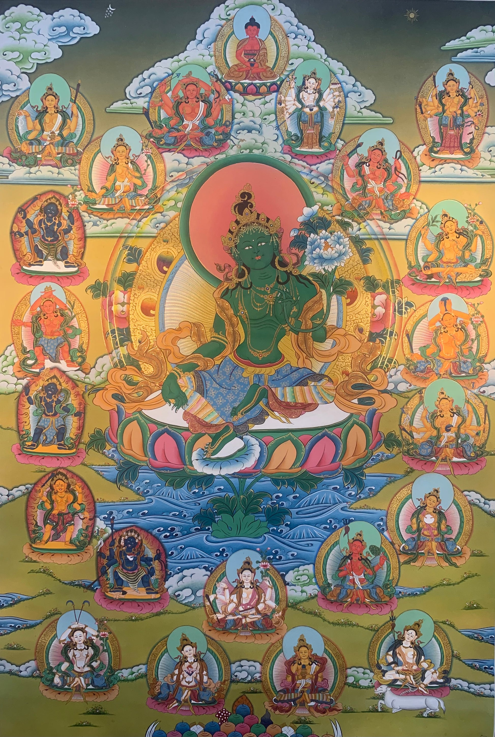 This beautiful hand-painted Tibetan thangka painting depicts the 21 Taras with Green Tara in the center. The 21 Taras systems come from the 'Twenty-One Praises of Tara' spoken by the Buddha Samantabhadra. One deception of Tara for each verse of the tantra text. There are 5 different traditions of the 21 Taras and the manner in which they are painted. The most common tradition in Tibetan thangka paintings is that of Atisha.