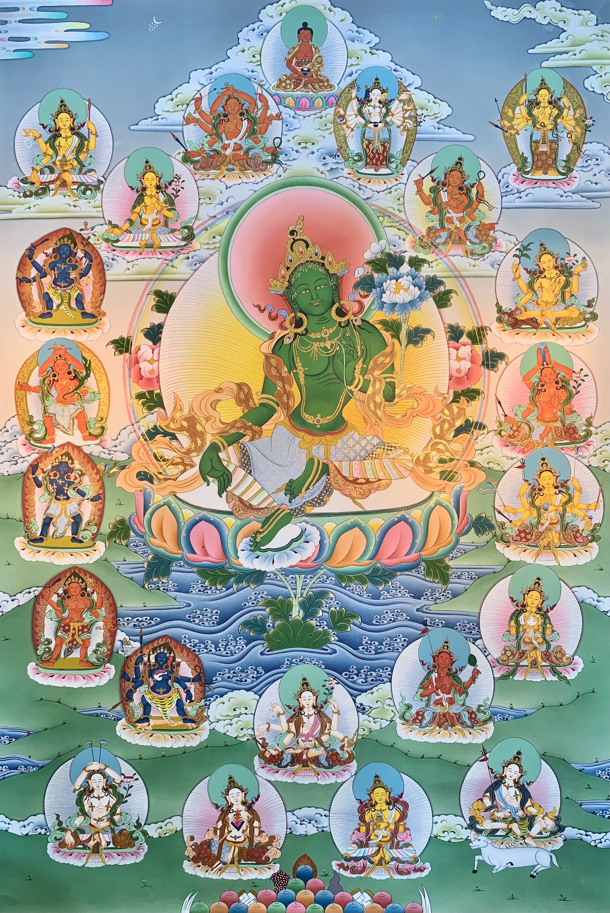 This beautiful hand-painted Tibetan thangka painting depicts the 21 Taras with Green Tara in the center. The 21 Taras systems come from the 'Twenty-One Praises of Tara' spoken by the Buddha Samantabhadra. One deception of Tara for each verse of the tantra text. There are 5 different traditions of the 21 Taras and the manner in which they are painted. The most common tradition in Tibetan thangka paintings is that of Atisha.