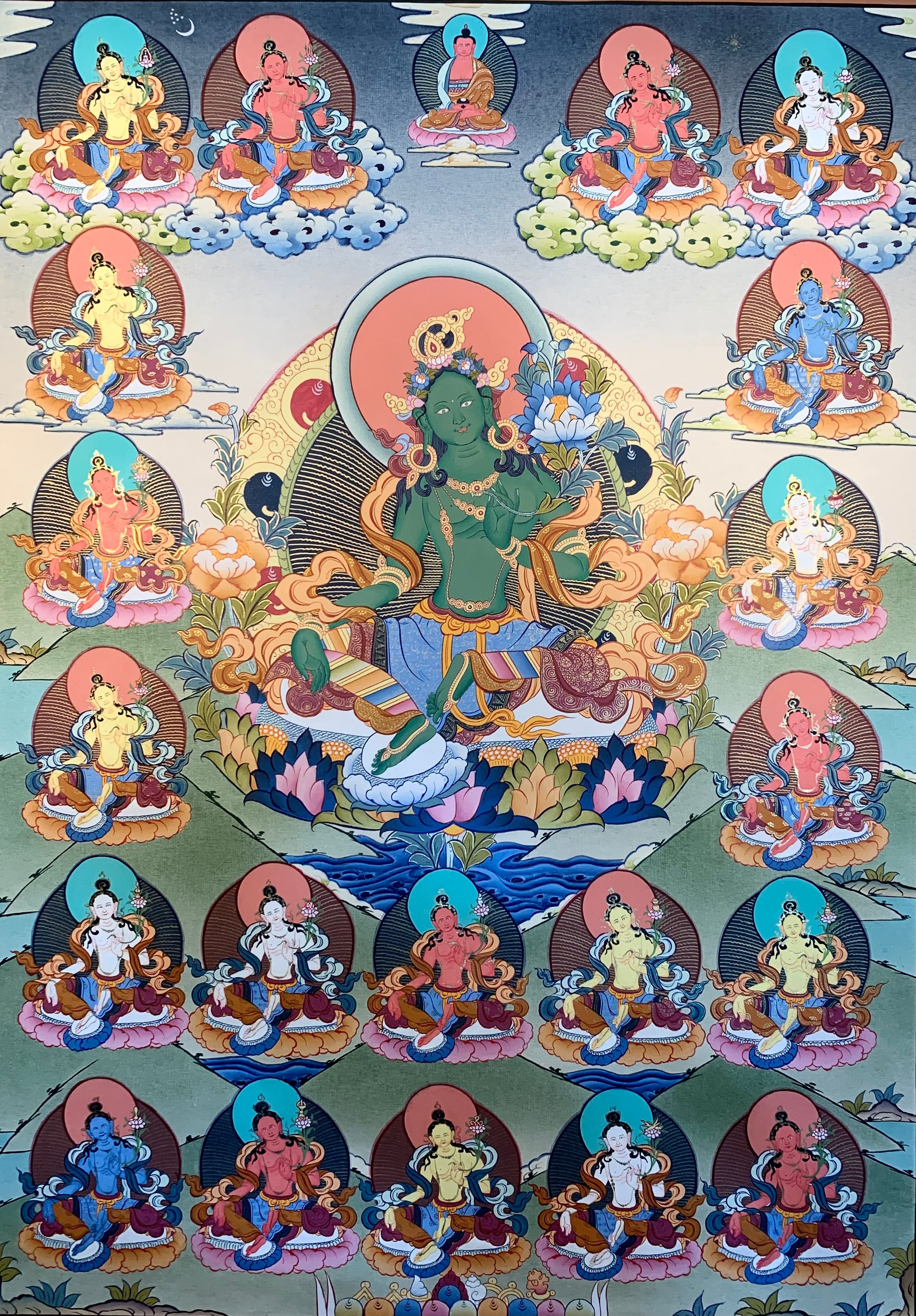 This beautiful hand-painted Tibetan thangka painting depicts the 21 Taras with Green Tara in the center. The 21 Taras systems come from the 'Twenty-One Praises of Tara' spoken by the Buddha Samantabhadra. One deception of Tara for each verse of the tantra text. There are 5 different traditions of the 21 Taras and the manner in which they are painted. The most common tradition in Tibetan thangka paintings is that of Atisha.