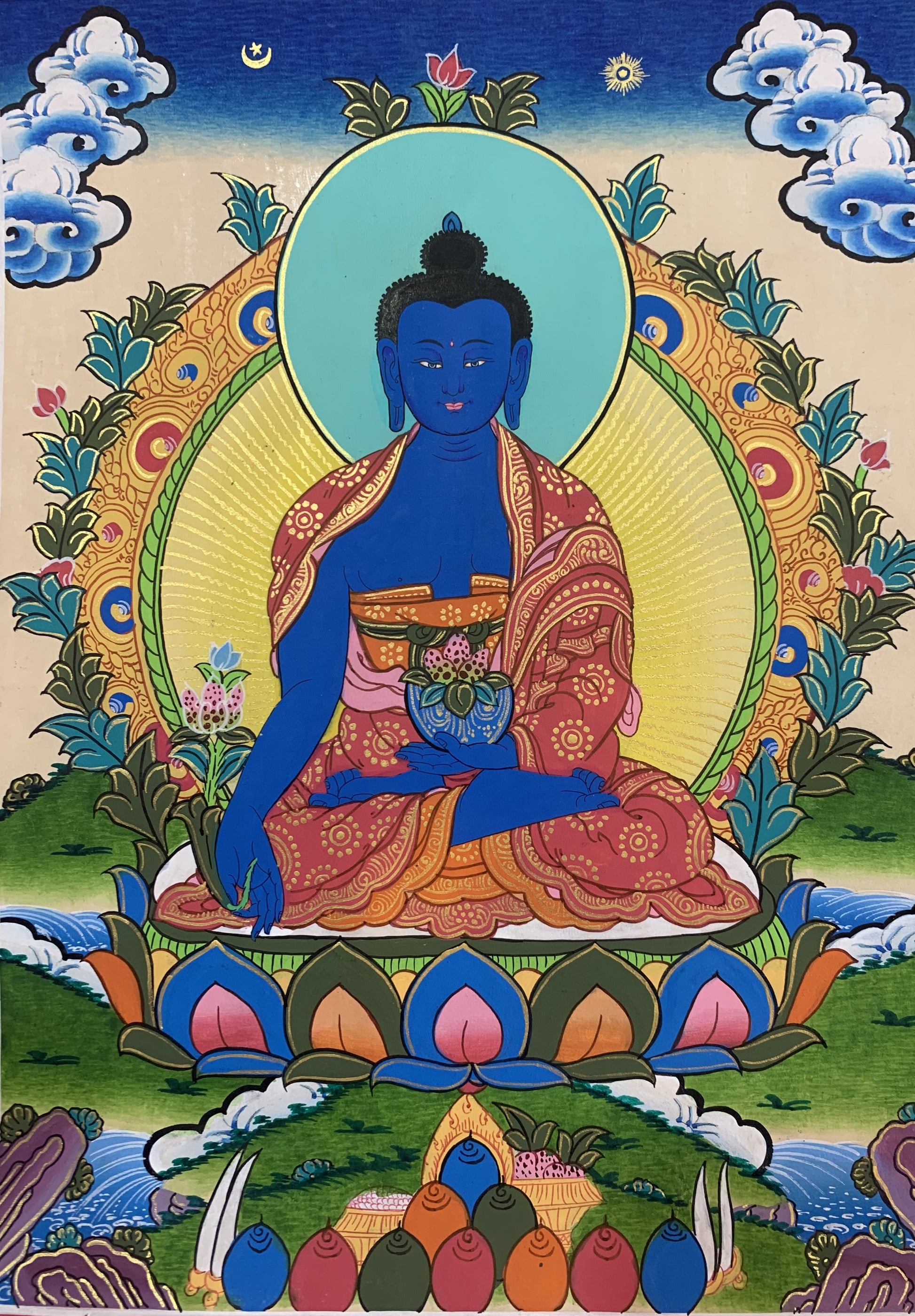 This beautiful hand painted Tibetan thangka painting depicts the Buddha of Medicine སངས་རྒྱས་སྨན་བླ་. His vow as a bodhisattva was to be able to fully free all sentient beings from their illnesses. The practices of Medicine Buddha are derived from the Bhaishajyaguru Sutra and according to Buddhist Tradition were taught by Shakyamuni Buddha.