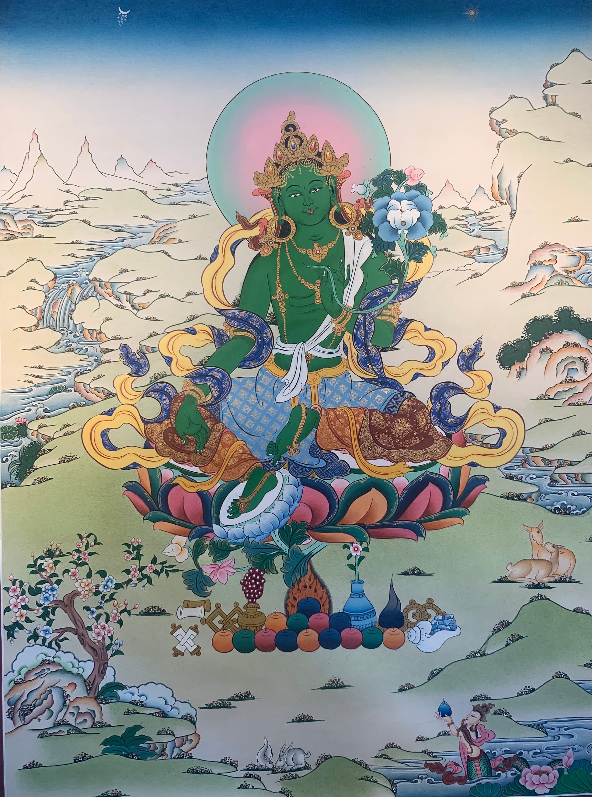 This beautiful hand painted Tibetan thangka painting depicts Green Tara སྒྲོལ་ལྗང་. Green Tara is regarded as the mother of all Bodhisattvas, a lover of all sentient beings. She is associated with enlightened activity, helping people pass beyond earthly existence. Green Tara grants refuge from all things which may obstruct, or cause trouble. She also embodies many qualities of the ‘feminine’, known as the mother of mercy and compassion, giving relief from bad karma.
