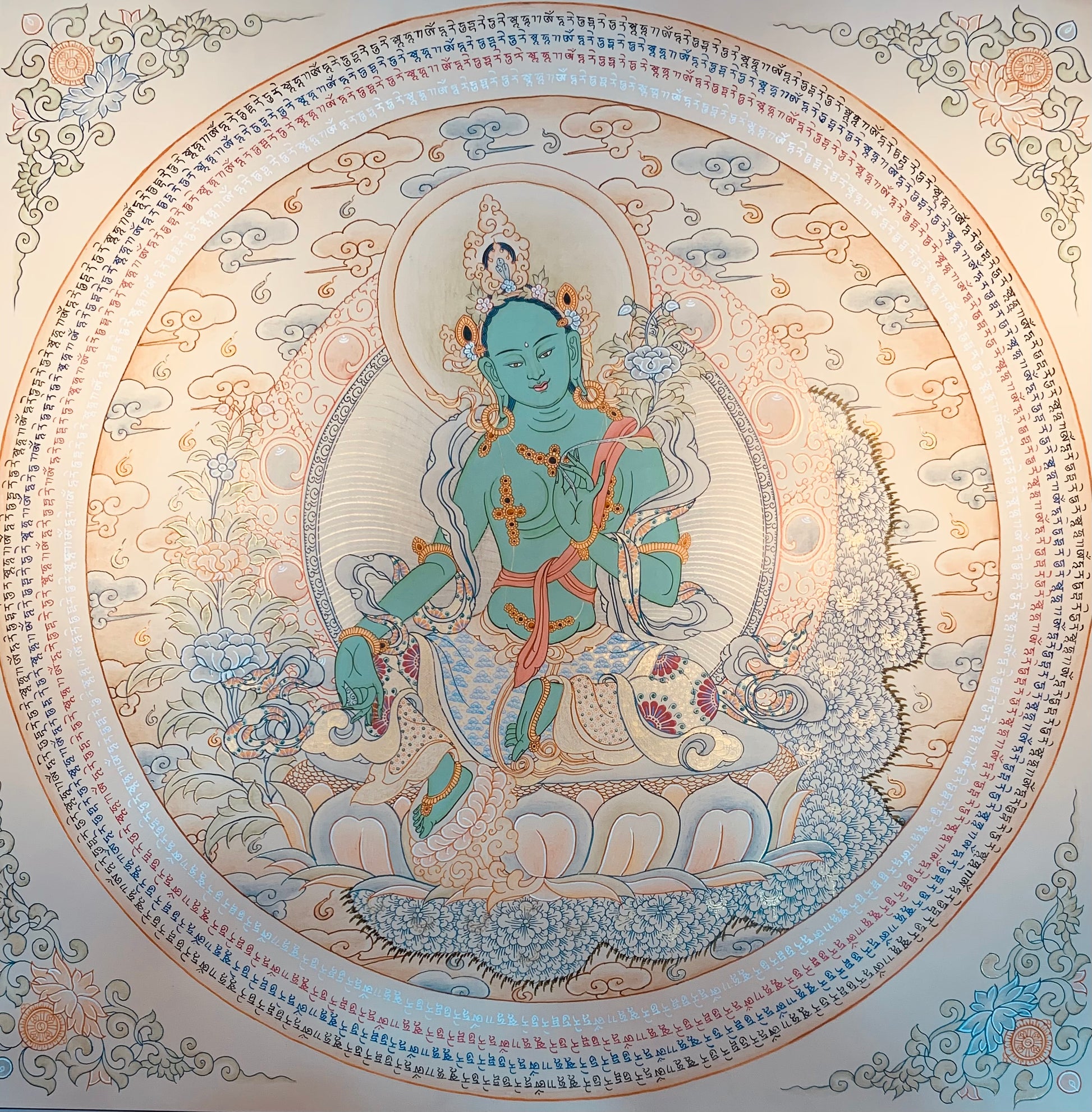This beautiful hand painted Tibetan thangka painting depicts Green Tara སྒྲོལ་ལྗང་. Green Tara is regarded as the mother of all Bodhisattvas, a lover of all sentient beings. She is associated with enlightened activity, helping people pass beyond earthly existence. Green Tara grants refuge from all things which may obstruct, or cause trouble. She also embodies many qualities of the ‘feminine’, known as the mother of mercy and compassion, giving relief from bad karma.