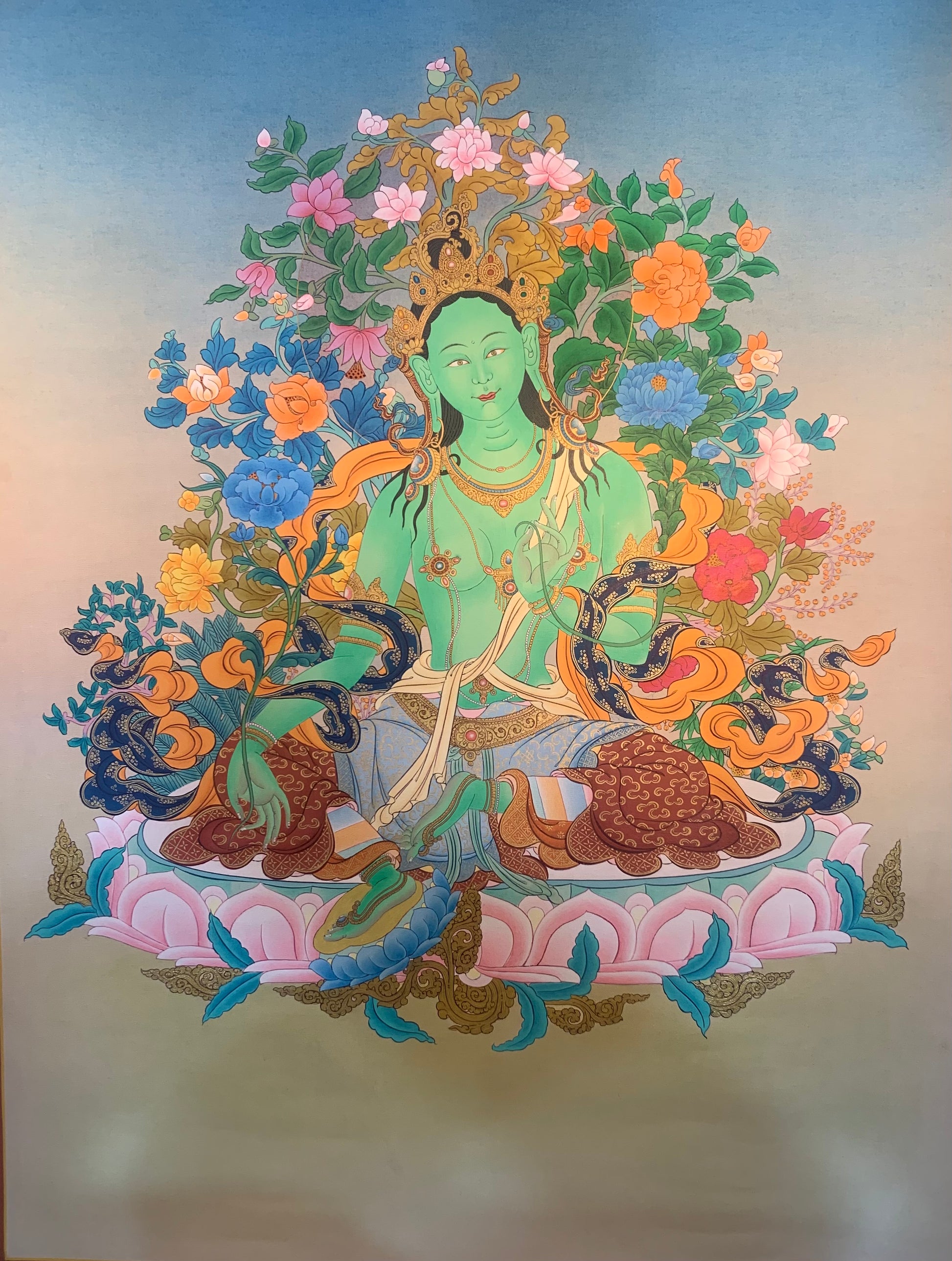 This beautiful hand painted Tibetan thangka painting depicts Green Tara སྒྲོལ་ལྗང་. Green Tara is regarded as the mother of all Bodhisattvas, a lover of all sentient beings. She is associated with enlightened activity, helping people pass beyond earthly existence. Green Tara grants refuge from all things which may obstruct, or cause trouble. She also embodies many qualities of the ‘feminine’, known as the mother of mercy and compassion, giving relief from bad karma.