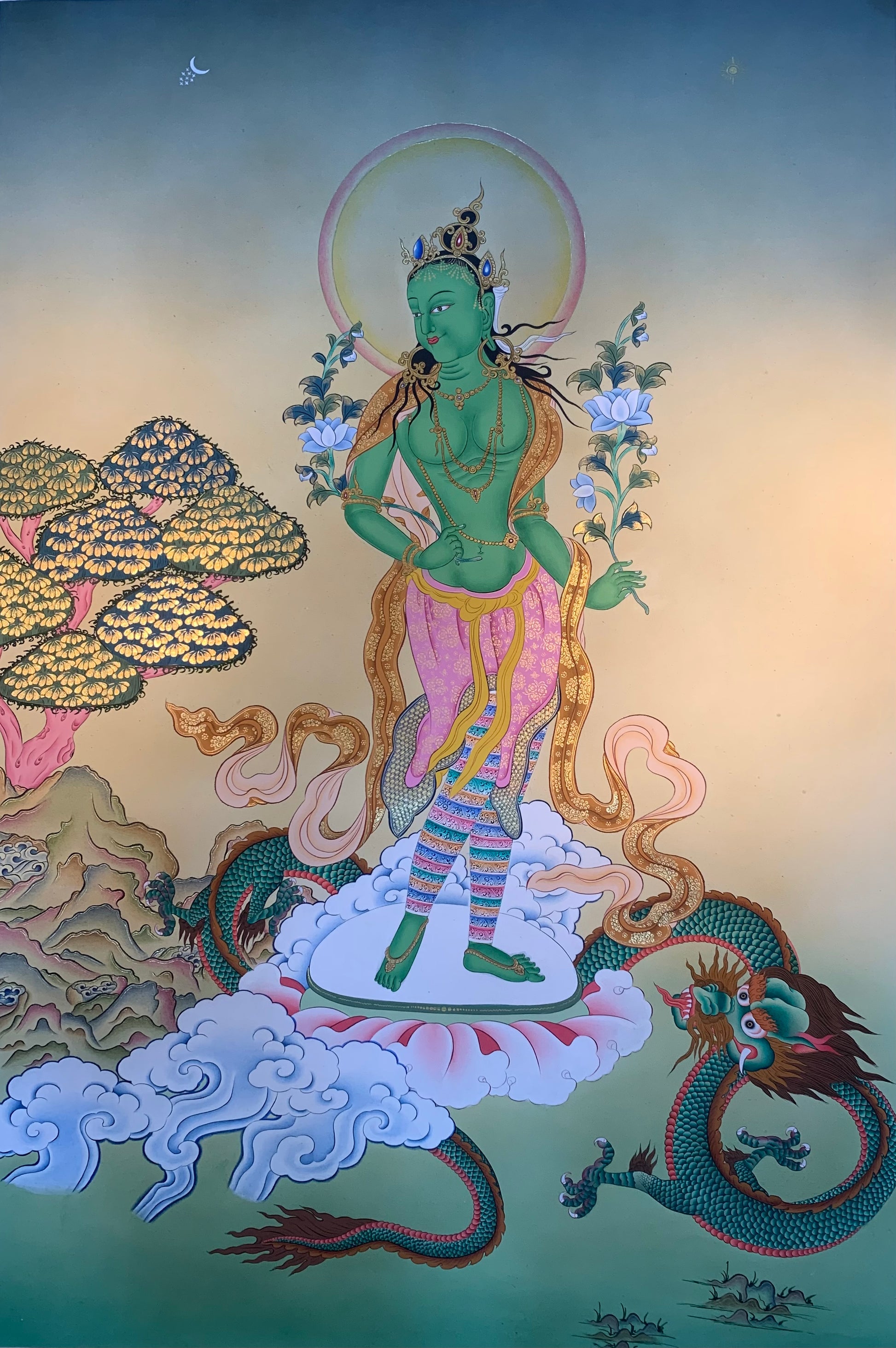 This beautiful hand painted Tibetan thangka painting depicts Green Tara སྒྲོལ་ལྗང་. Green Tara is regarded as the mother of all Bodhisattvas, a lover of all sentient beings. She is associated with enlightened activity, helping people pass beyond earthly existence. Green Tara grants refuge from all things which may obstruct, or cause trouble. She also embodies many qualities of the ‘feminine’, known as the mother of mercy and compassion, giving relief from bad karma.