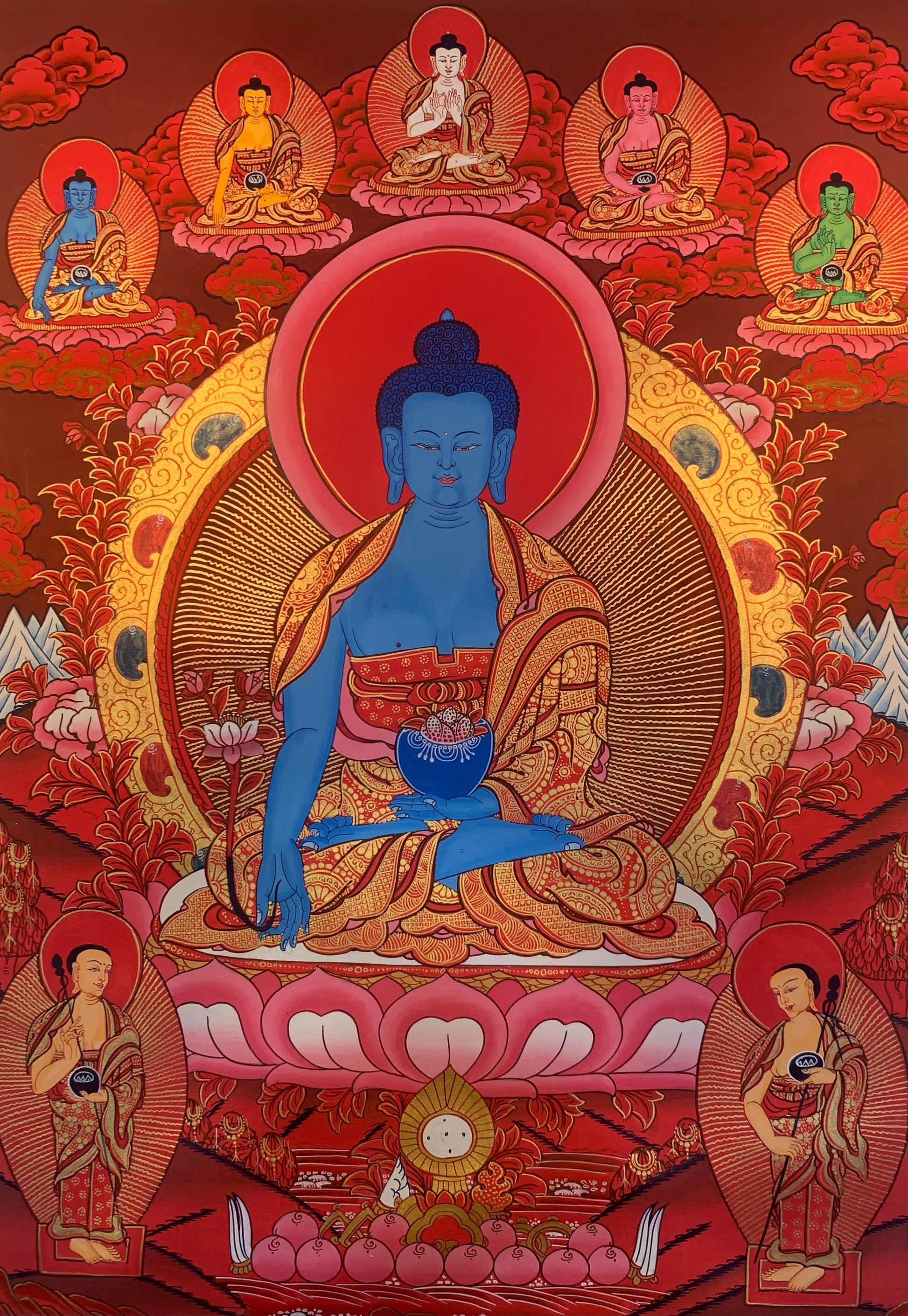 This beautiful hand painted Tibetan thangka painting depicts the Buddha of Medicine སངས་རྒྱས་སྨན་བླ་. His vow as a bodhisattva was to be able to fully free all sentient beings from their illnesses. The practices of Medicine Buddha are derived from the Bhaishajyaguru Sutra and according to Buddhist Tradition were taught by Shakyamuni Buddha.