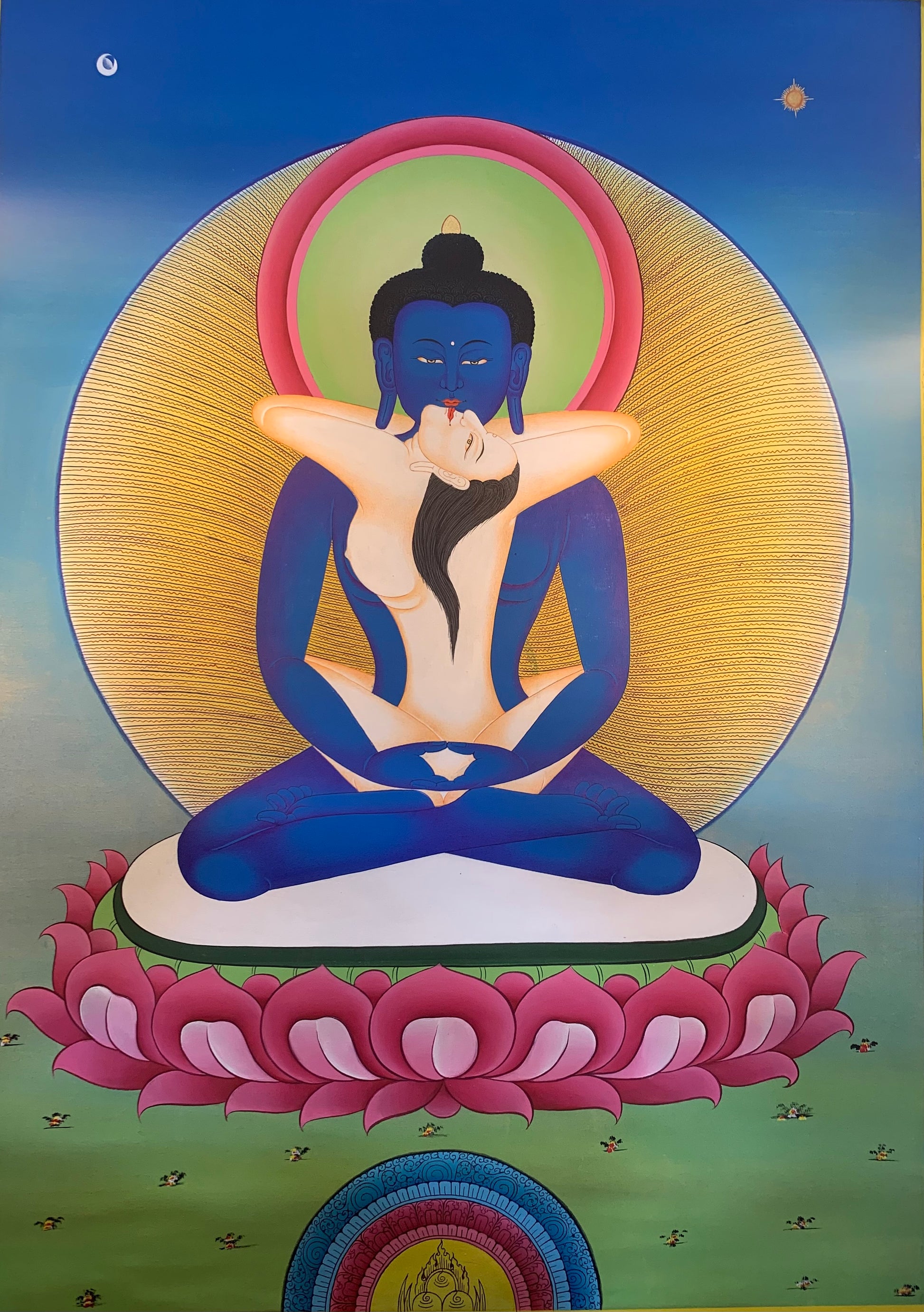 This beautiful hand painted Tibetan thangka painting depicts Buddha Samantabhadra ཀུན་ཏུ་བཟང་པོ་ - Known as the 'Primordial Buddha'. Samantabhadra, or Kuntu Zangpo in Tibetan, represents the primordial human nature, pure and naked from any stains or concepts.
