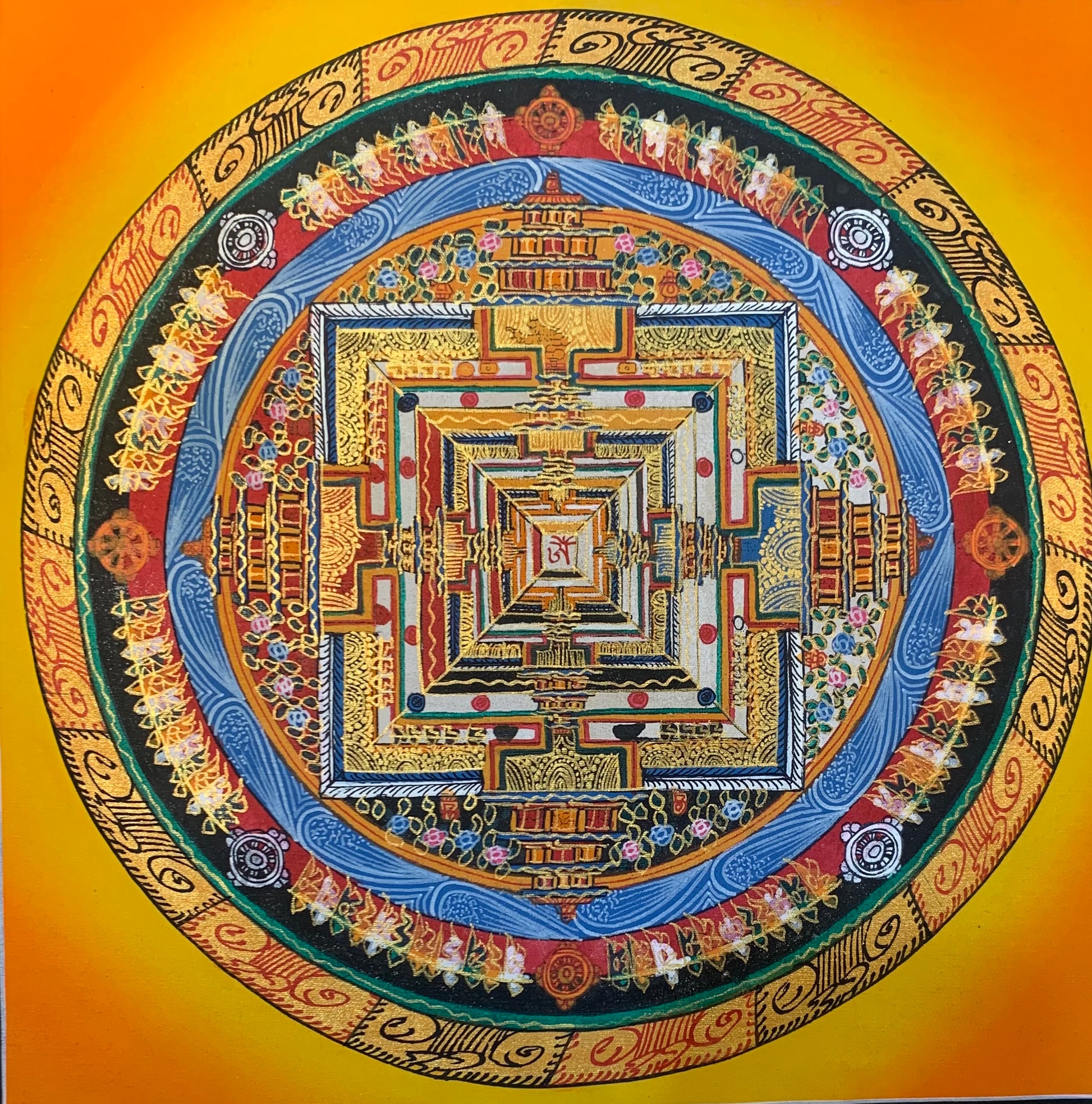 This Kalachakra Mandala Tibetan thangka painting is hand-painted by master local artists in the Kathmandu Valley, Nepal. The Buddhist Thangka depicts a beautifully detailed Kalachakra mandala design and comes unframed and ready for framing. It is painted entirely by hand on cotton canvas using natural mineral and vegetable pigments with 24K gold details. The complicated designs, intricate brushstrokes, and extraordinary detail make these thangkas authentic works of art. A true masterpiece, this painting is the perfect addition to your home, meditation space, room shrine or altar space.