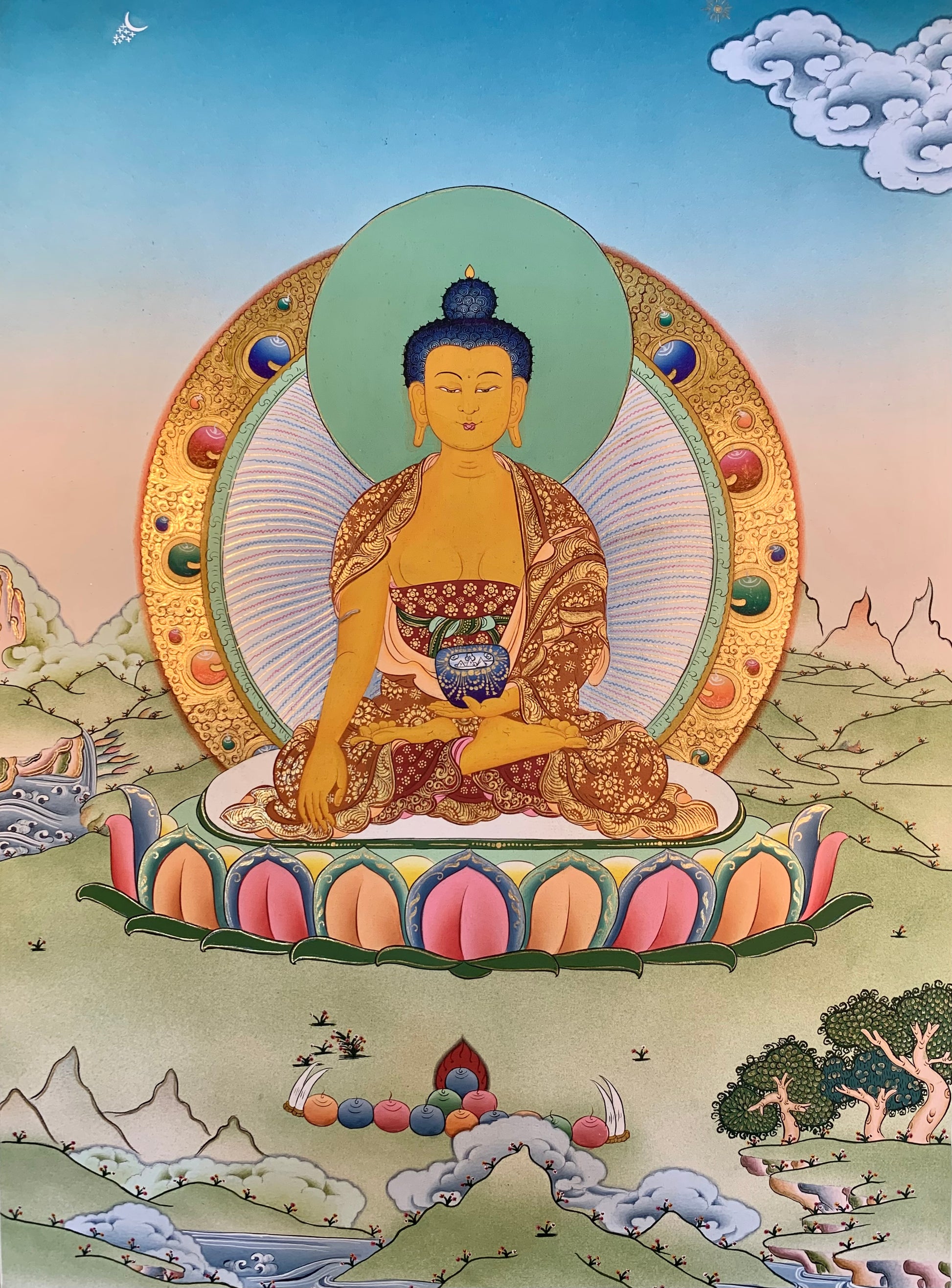 This beautiful hand painted Tibetan thangka depicts Shakyamuni Buddha སངས་རྒྱས་ཤཱཀྱ་ཐུབ་པ། (aka Gautama Buddha) sitting on a lotus platform. The Buddha is seated with his right hand in earth-touching bhumisparsa mudra and with an alms bowl filled with nectar in his left hand.
