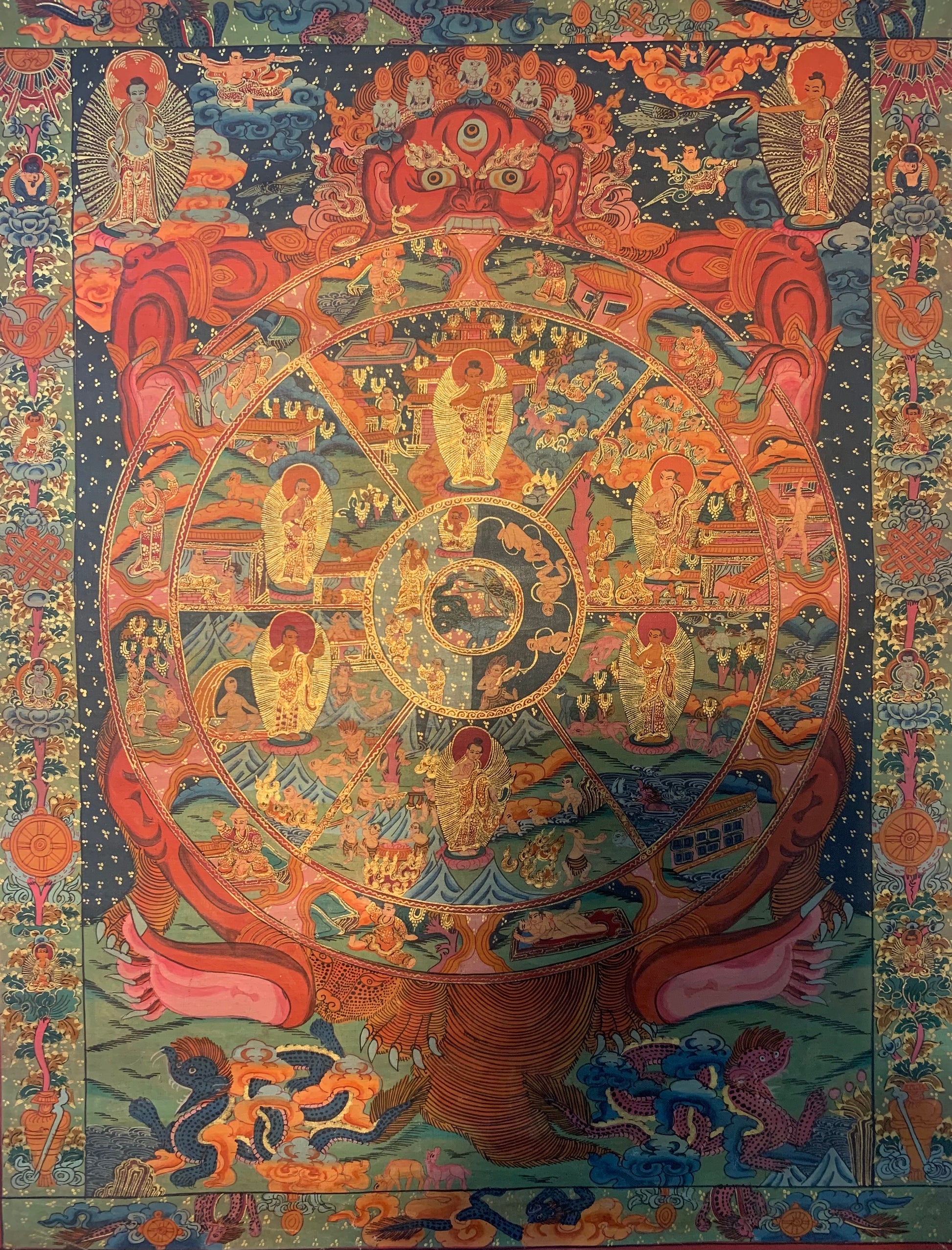 This beautiful hand painted Tibetan thangka painting depicts The Wheel of Life སྲིད་པའི་འཁོར་ལོ་ (bhavacakra), also known as Wheel of Existence, or Wheel of Cyclic Existence.