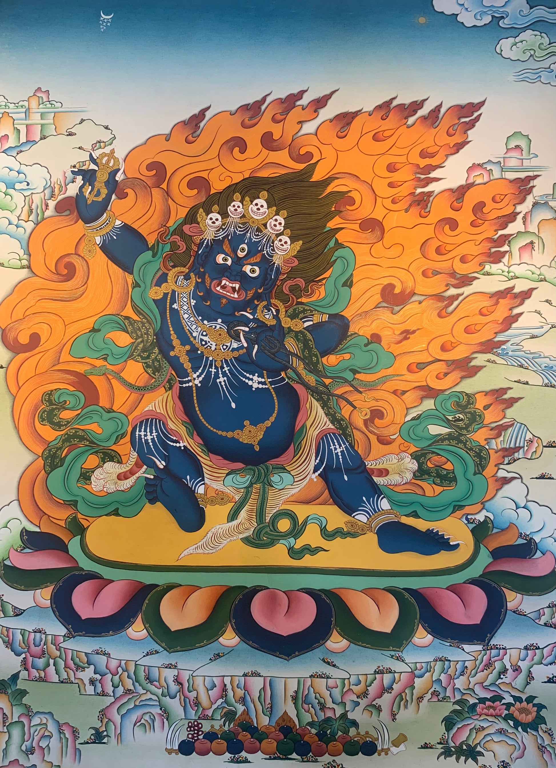 This beautiful hand painted Tibetan thangka painting depicts Vajrapani ཕྱག་ན་རྡོ་རྗེ་. Vajrapani is one of the eight great bodhisattvas and symbolizes the power of the Buddha.