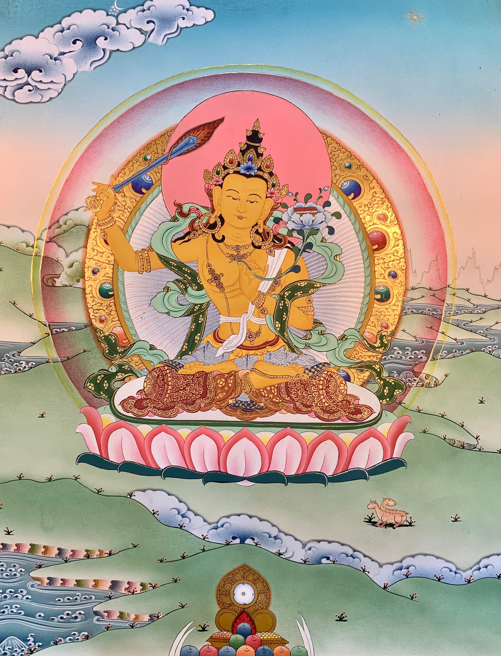 This beautiful hand painted Tibetan thangka painting depicts Mañjushri འཇམ་དཔལ་, also known as Mañjughosha. Mañjushri is the embodiment of the knowledge and wisdom of all the Buddhas. He holds a sword that cuts all ignorance in his right hand and a Prajnaparamita sutra book in the left hand and supported by a flower blossom.