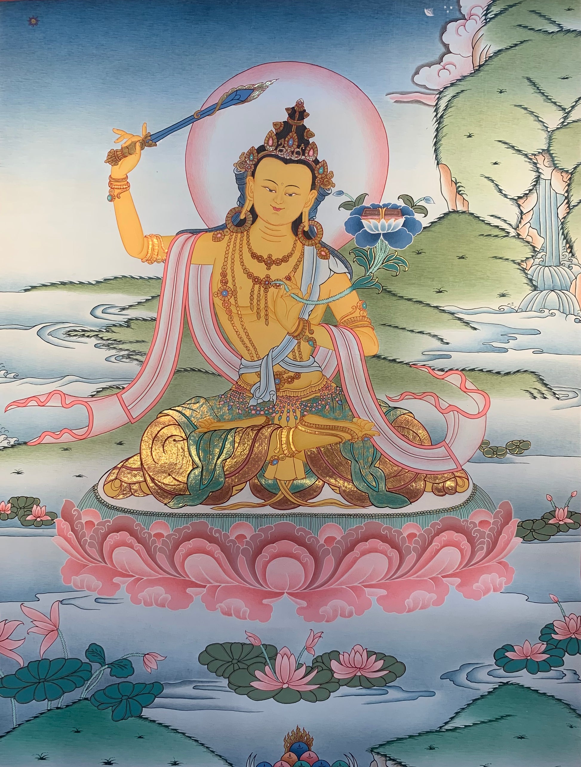 This beautiful hand painted Tibetan thangka painting depicts Mañjushri འཇམ་དཔལ་, also known as Mañjughosha. Mañjushri is the embodiment of the knowledge and wisdom of all the Buddhas. He holds a sword that cuts all ignorance in his right hand and a Prajnaparamita sutra book in the left hand and supported by a flower blossom.