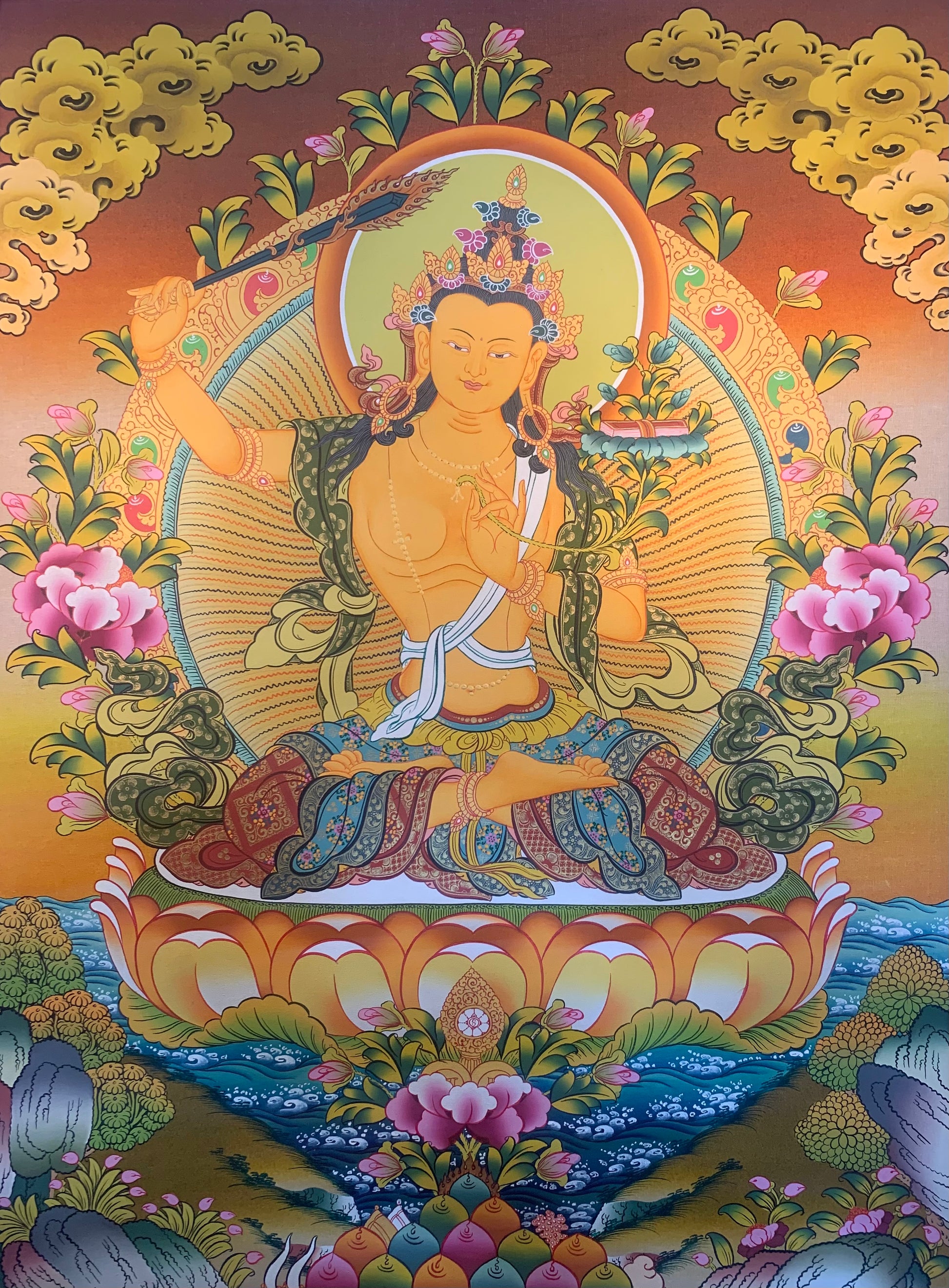 This beautiful hand painted Tibetan thangka painting depicts Mañjushri འཇམ་དཔལ་, also known as Mañjughosha. Mañjushri is the embodiment of the knowledge and wisdom of all the Buddhas. He holds a sword that cuts all ignorance in his right hand and a Prajnaparamita sutra book in the left hand and supported by a flower blossom.