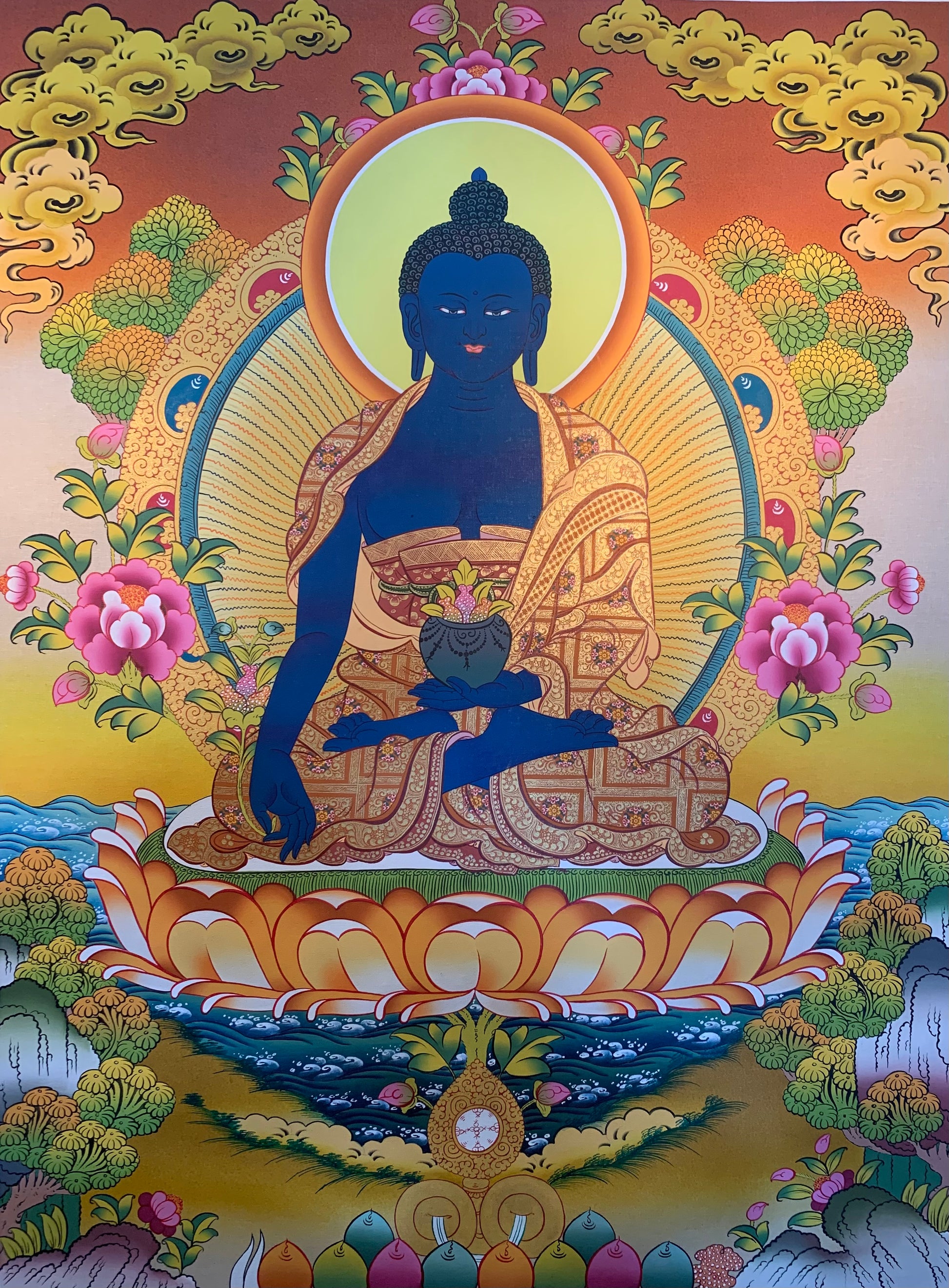 This beautiful hand painted Tibetan thangka painting depicts the Buddha of Medicine སངས་རྒྱས་སྨན་བླ་. His vow as a bodhisattva was to be able to fully free all sentient beings from their illnesses. The practices of Medicine Buddha are derived from the Bhaishajyaguru Sutra and according to Buddhist Tradition were taught by Shakyamuni Buddha.
