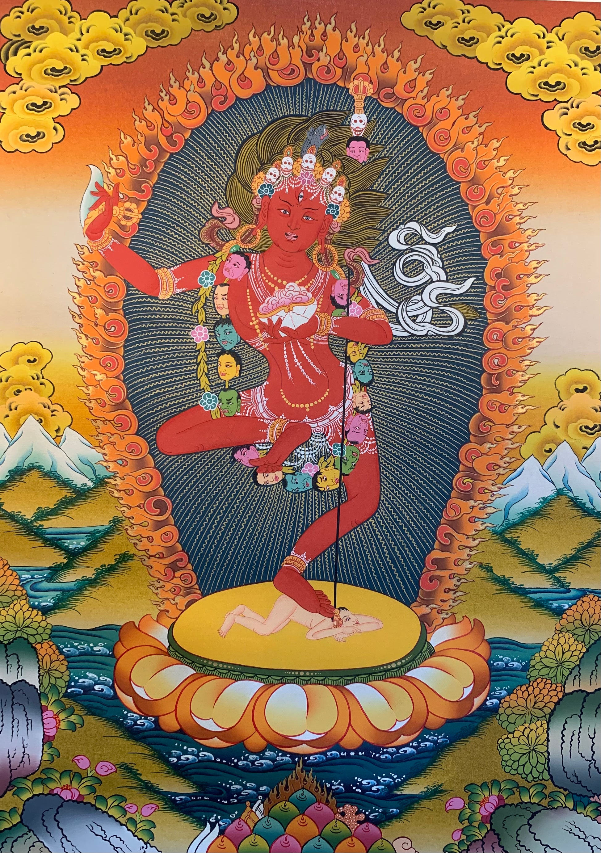 With a fierce expression, slightly peaceful and slightly wrathful, she is red in colour with one face, three eyes and dark yellow hair flowing upward, at the crown a black boar's head. The right hand holds aloft a curved flaying knife with a gold vajra handle and the left to the heart a white skullcup. In the bend of the left elbow stands an upright tantric katvanga staff, ornate with an orange streamer. Adorned with a tiara of gold and five white skulls, green ribbons and gold and jewel earrings, a garland of fifty fresh heads, a garland of flowers, a bone necklace, girdle, bracelets and anklets, she wears a long green scarf around the shoulders. With the right leg raised in a dancing posture, the left presses on a sun disc atop a prone figure. Above a moon disc and pink lotus seat, she is completely surrounded by the tight curling flames of orange pristine awareness fire.