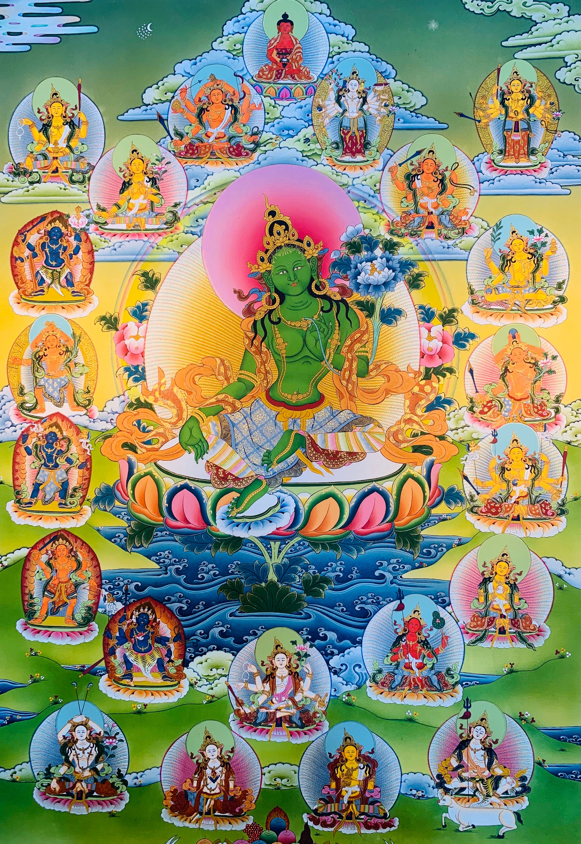 This beautiful hand-painted Tibetan thangka painting depicts the 21 Taras with Green Tara in the center. The 21 Taras systems come from the 'Twenty-One Praises of Tara' spoken by the Buddha Samantabhadra. One deception of Tara for each verse of the tantra text. There are 5 different traditions of the 21 Taras and the manner in which they are painted. The most common tradition in Tibetan thangka paintings is that of Atisha.