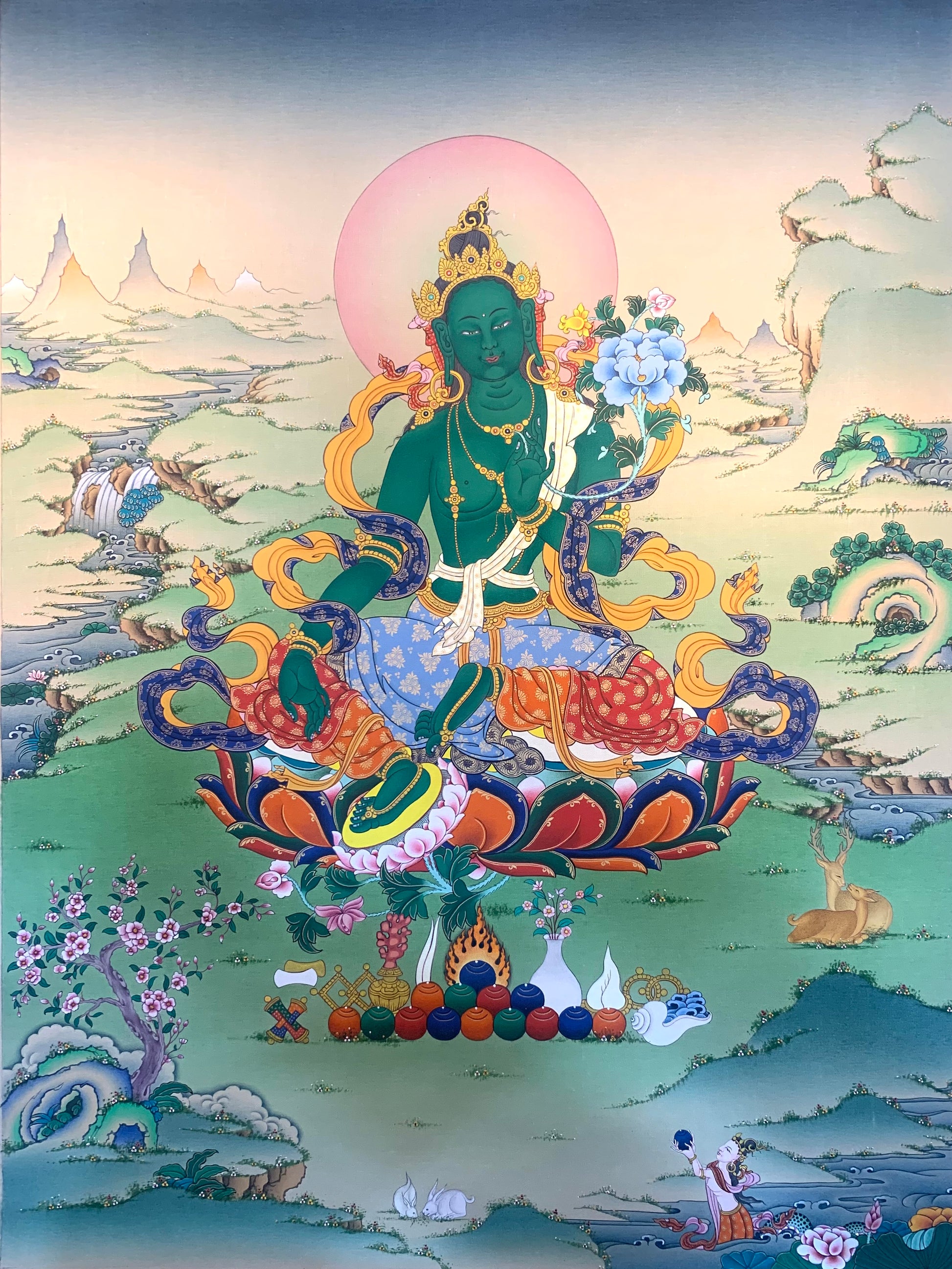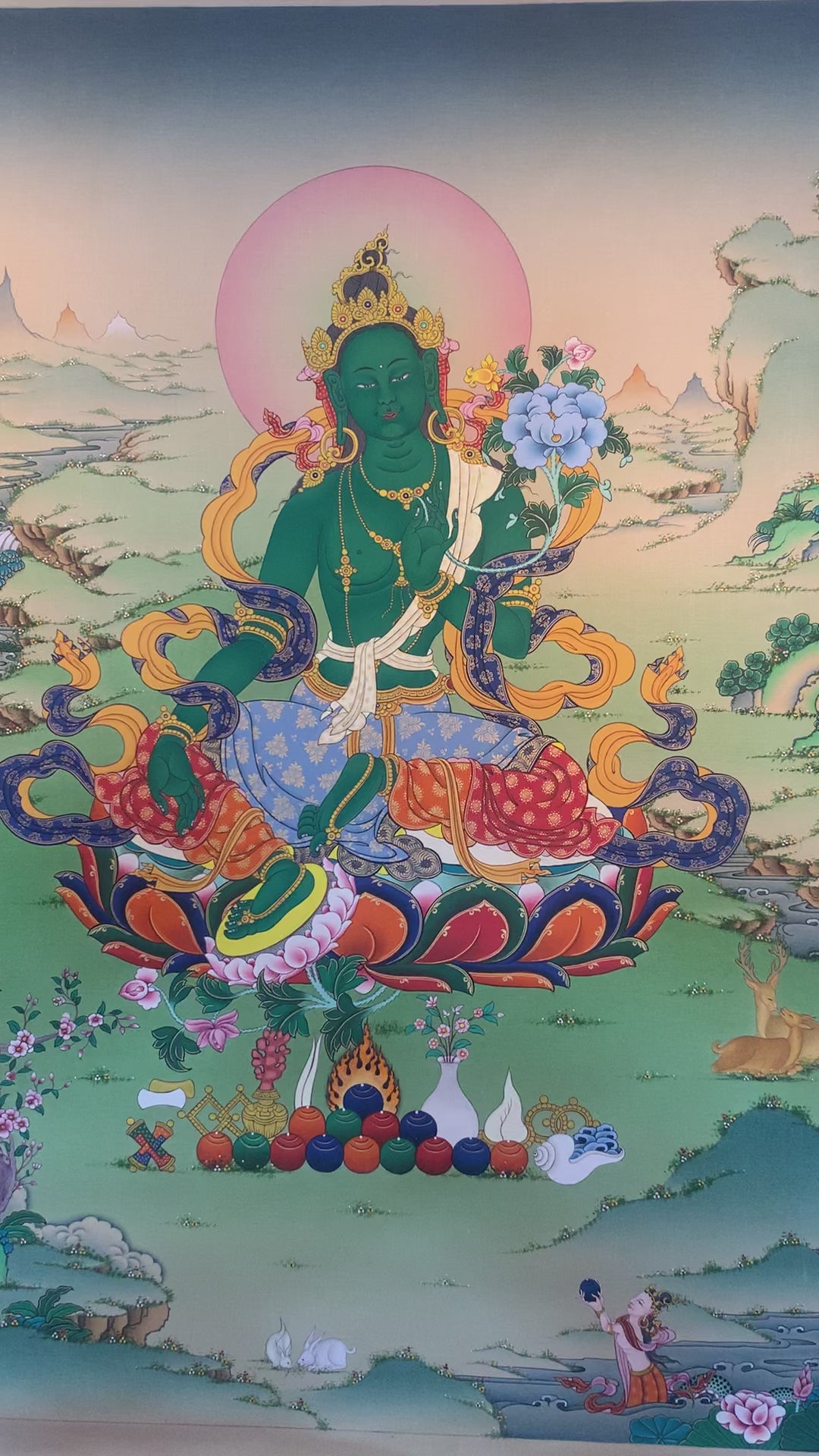 This beautiful hand painted Tibetan thangka painting depicts Green Tara སྒྲོལ་ལྗང་།. Green Tara is regarded as the mother of all Bodhisattvas, a lover of all sentient beings. She is associated with enlightened activity, helping people pass beyond earthly existence. Green Tara grants refuge from all things which may obstruct, or cause trouble. She also embodies many qualities of the ‘feminine’, known as the mother of mercy and compassion, giving relief from bad karma.