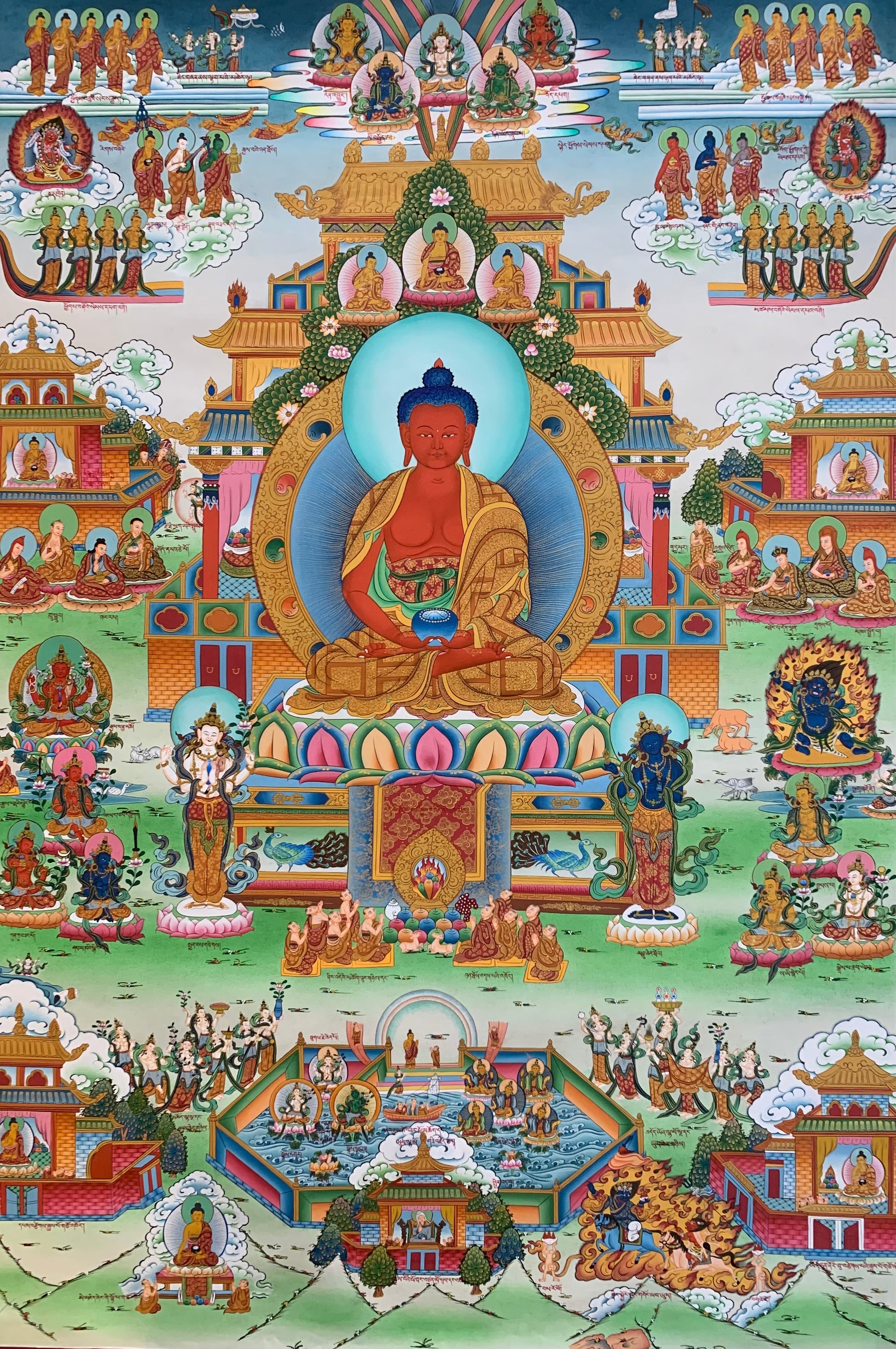 This beautiful hand painted Tibetan thangka painting depicts Amitabha Buddha འོད་དཔག་མེད།. Amitabha is the Buddha of Boundless Light and Sukhavati (Dewachen) is his blissful Buddha field.