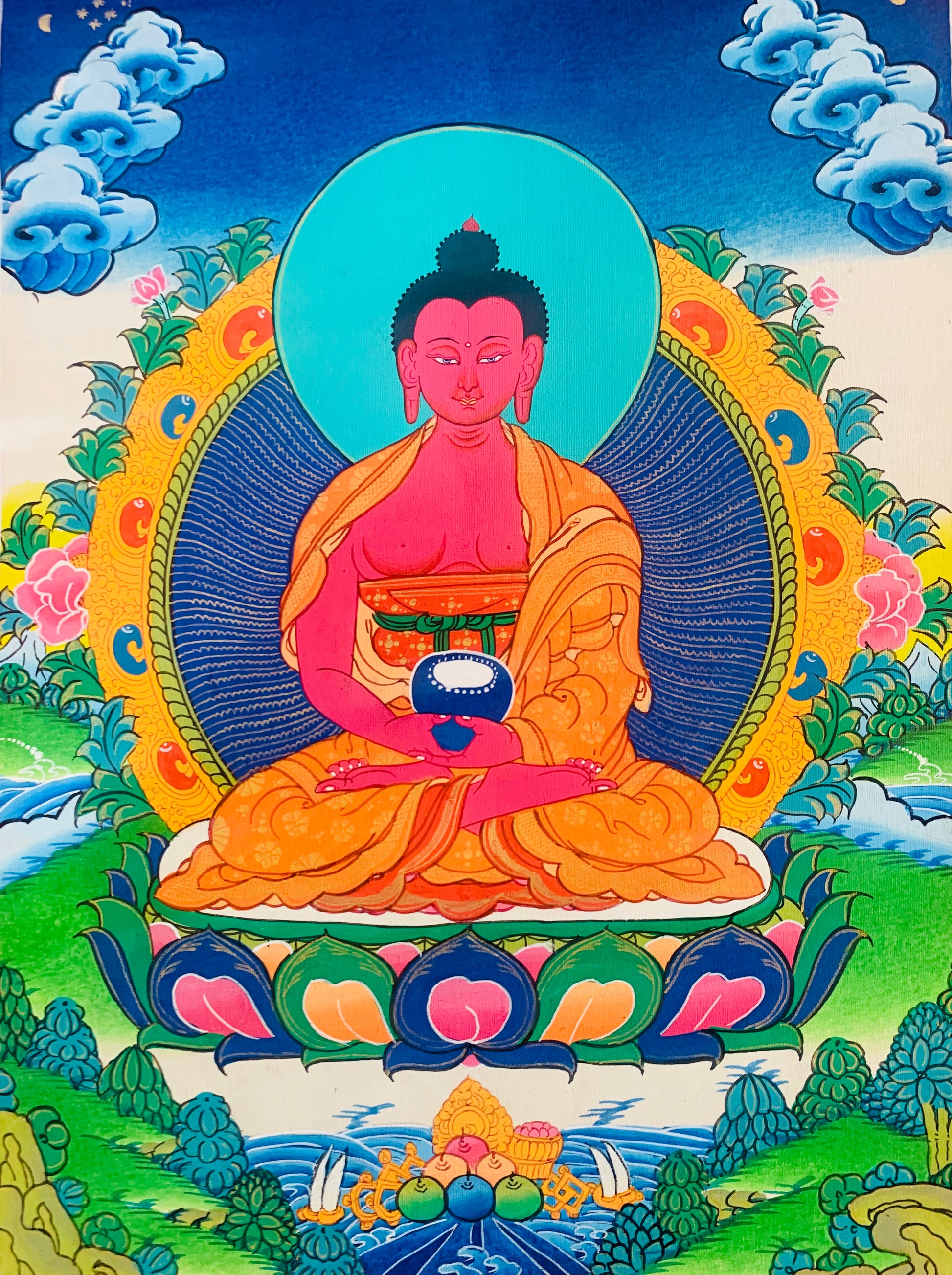 这幅美丽的手绘西藏唐卡画描绘了阿弥陀佛 འོད་དཔག་མེད།。 阿弥陀佛是无量光佛,苏哈瓦底 (Dewachen) 是他的福地。
