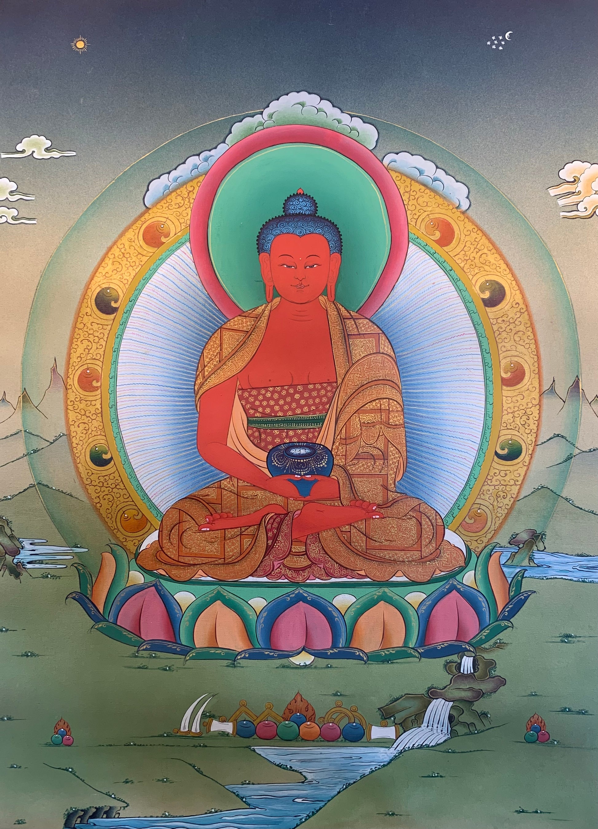 This beautiful hand painted Tibetan thangka painting depicts Amitabha Buddha འོད་དཔག་མེད།. Amitabha is the Buddha of Boundless Light and Sukhavati (Dewachen) is his blissful Buddha field.