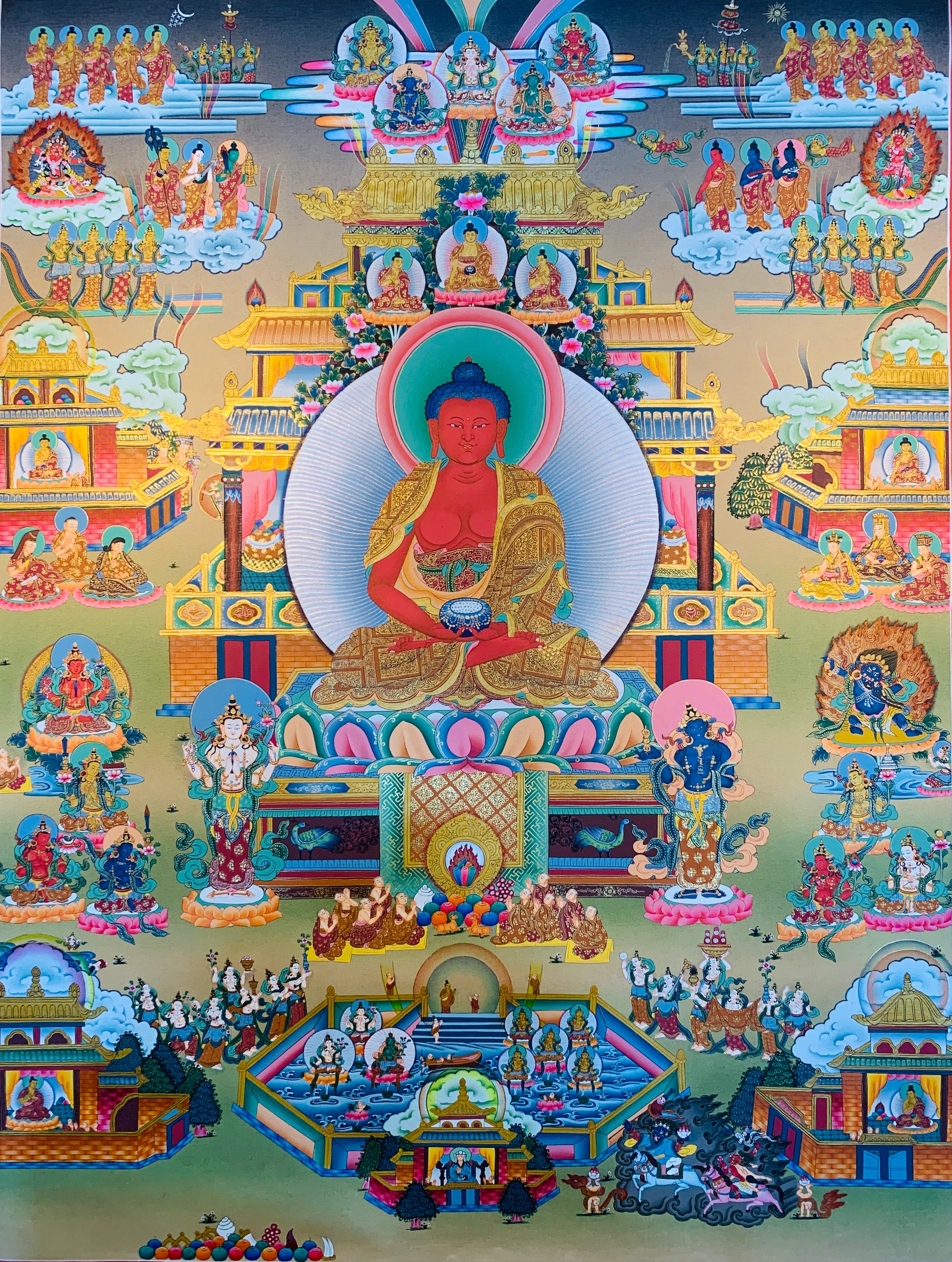 这幅美丽的手绘西藏唐卡画描绘了阿弥陀佛འོད་དཔག་མེད།。 阿弥陀佛是无量光佛,苏哈瓦底(Dewachen)是他的极乐佛土。