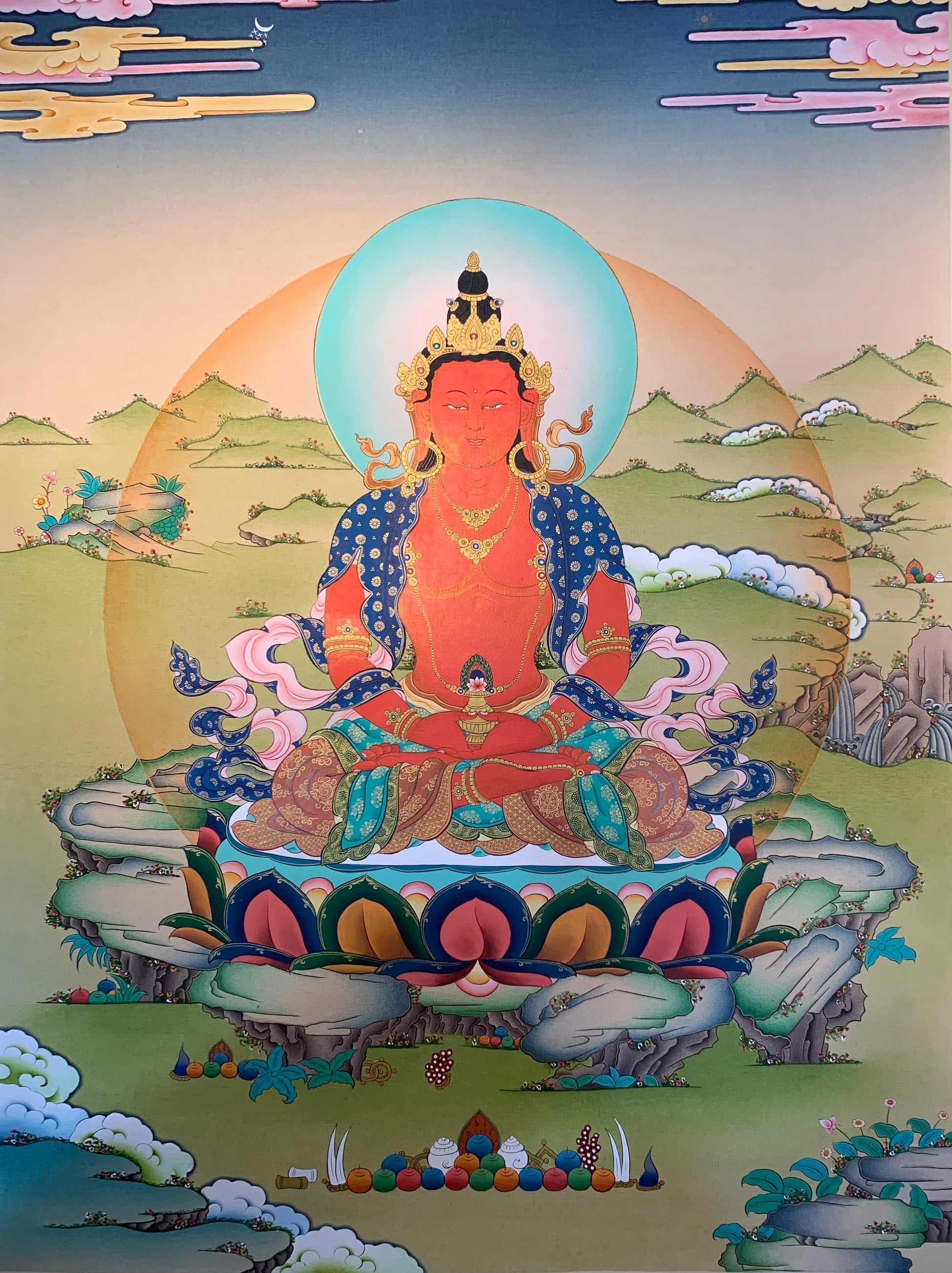 This beautiful hand painted Tibetan thangka painting depicts Amitayus Buddha