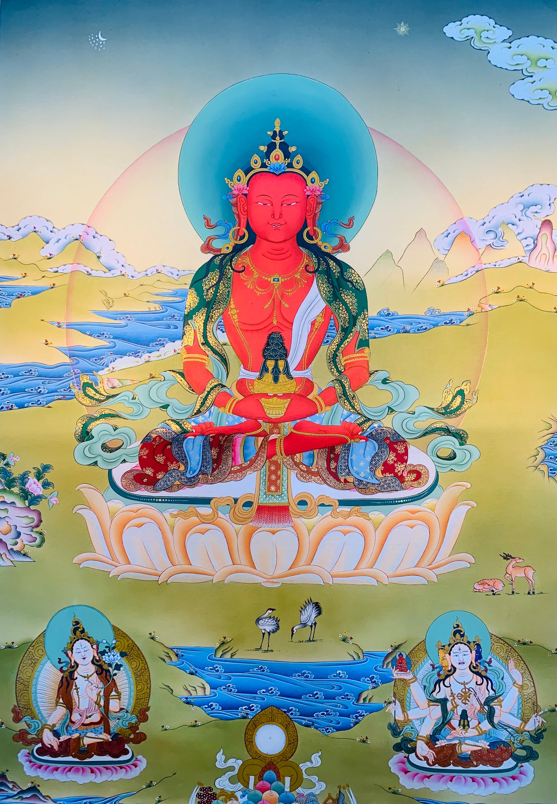 This beautiful hand painted Tibetan thangka painting depicts Amitayus Buddha
