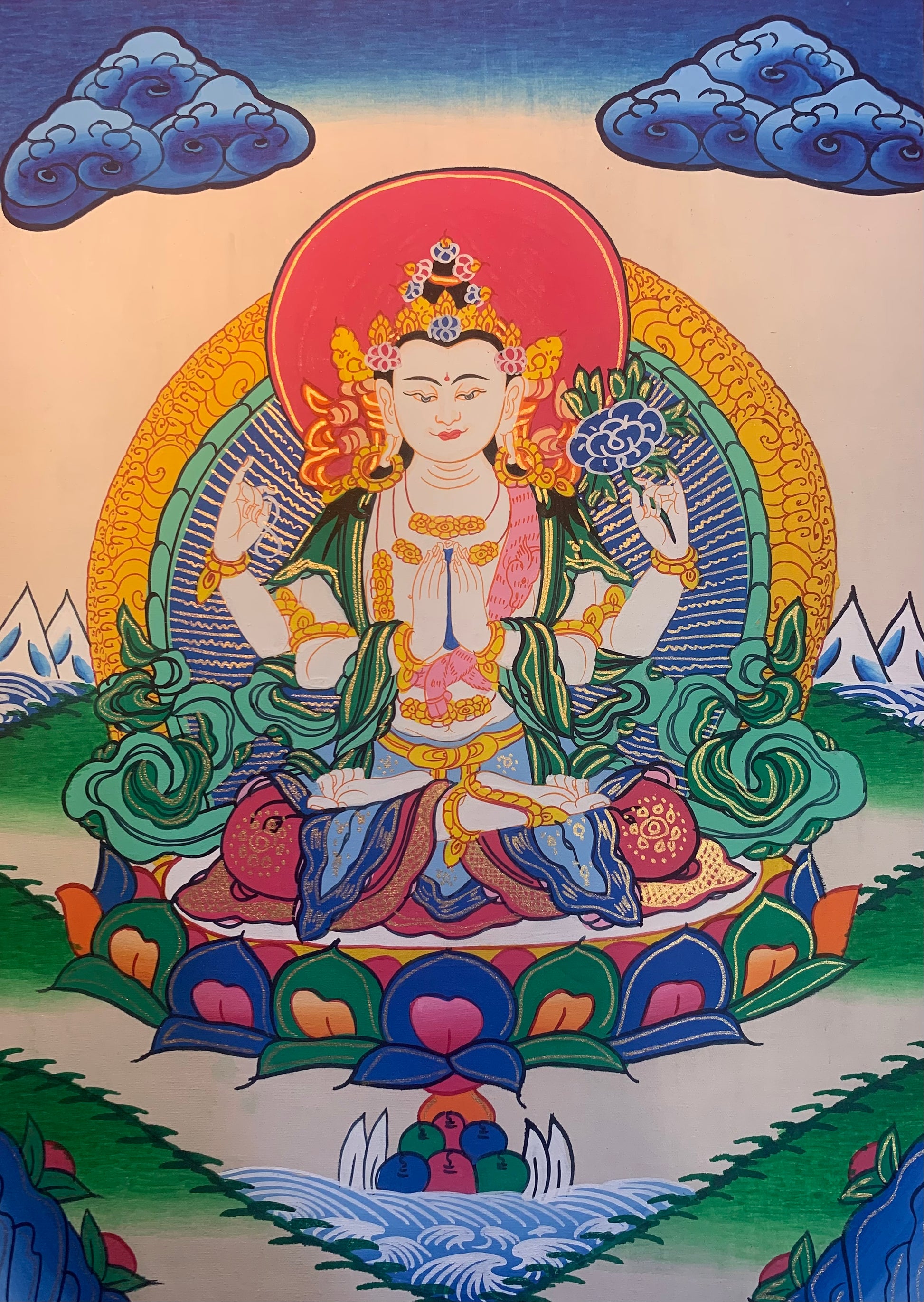 This beautiful hand painted Tibetan thangka painting depicts Chenrezig སྤྱན་རས་གཟིགས་ / Avalokiteshvara - Known as the buddha of compassion and the patron deity of Tibet.