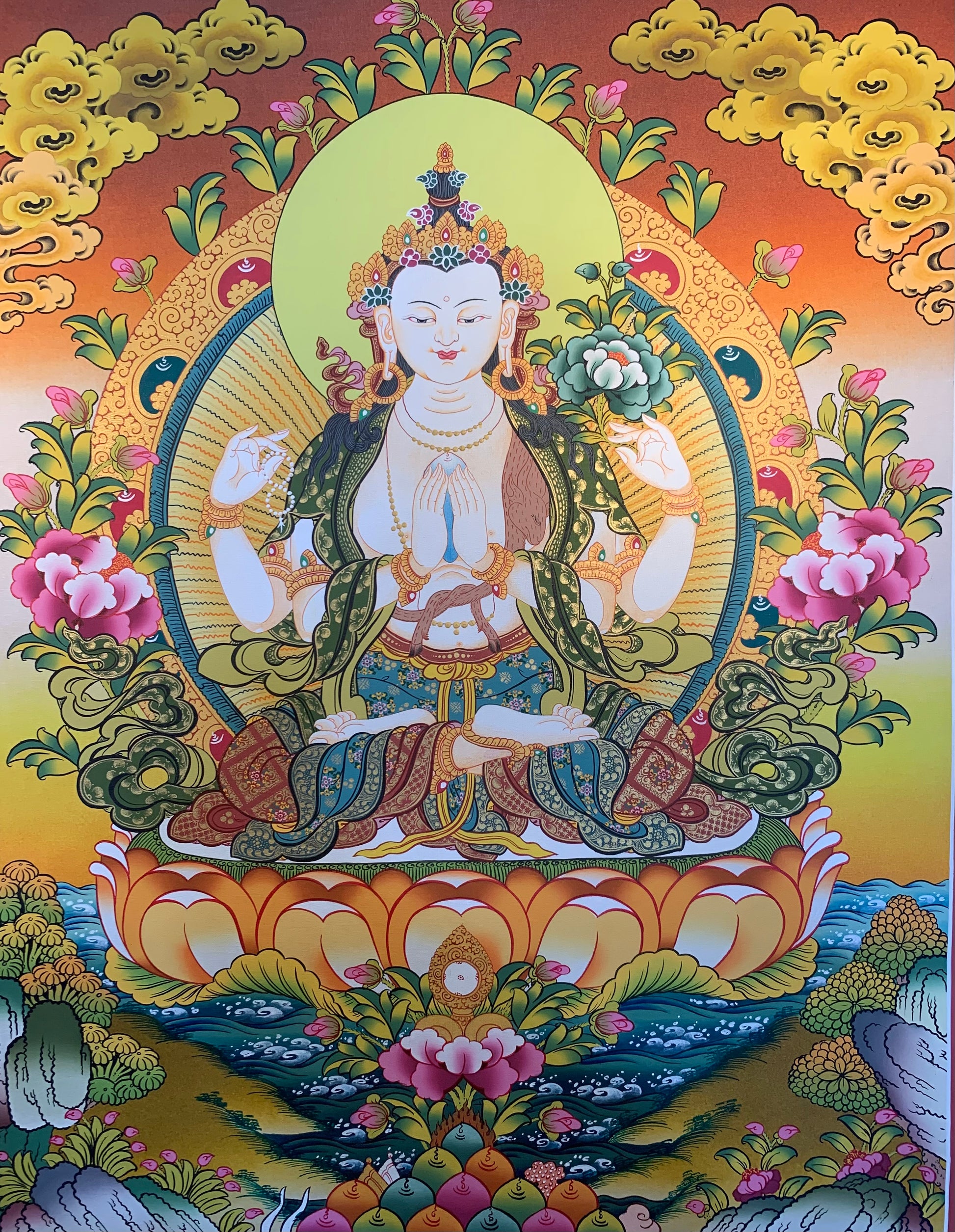 This beautiful hand painted Tibetan thangka painting depicts Chenrezig སྤྱན་རས་གཟིགས་ / Avalokiteshvara - Known as the buddha of compassion and the patron deity of Tibet.