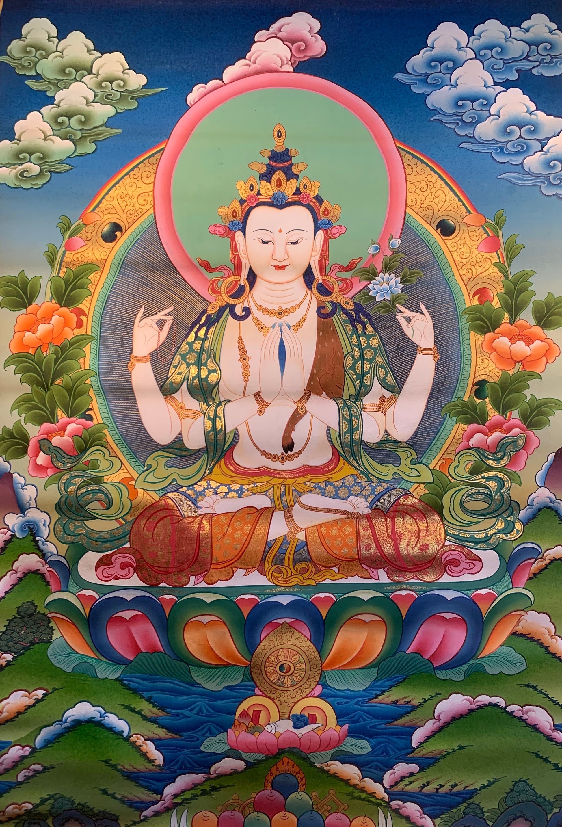 This beautiful hand painted Tibetan thangka painting depicts Chenrezig སྤྱན་རས་གཟིགས་ / Avalokiteshvara - Known as the buddha of compassion and the patron deity of Tibet.