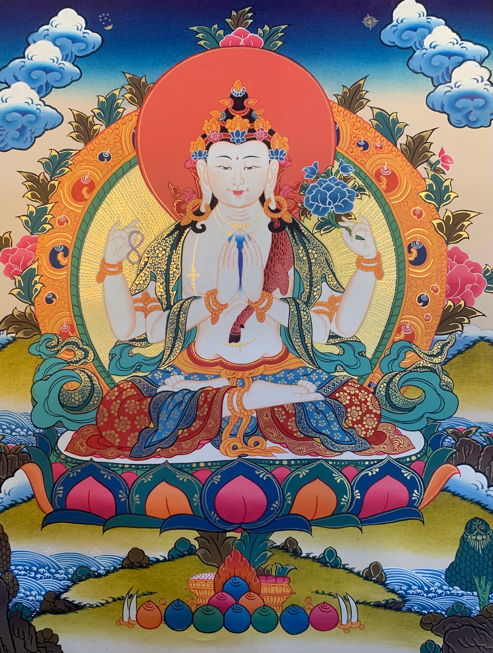 This beautiful hand painted Tibetan thangka painting depicts Chenrezig སྤྱན་རས་གཟིགས་ / Avalokiteshvara - Known as the buddha of compassion and the patron deity of Tibet.