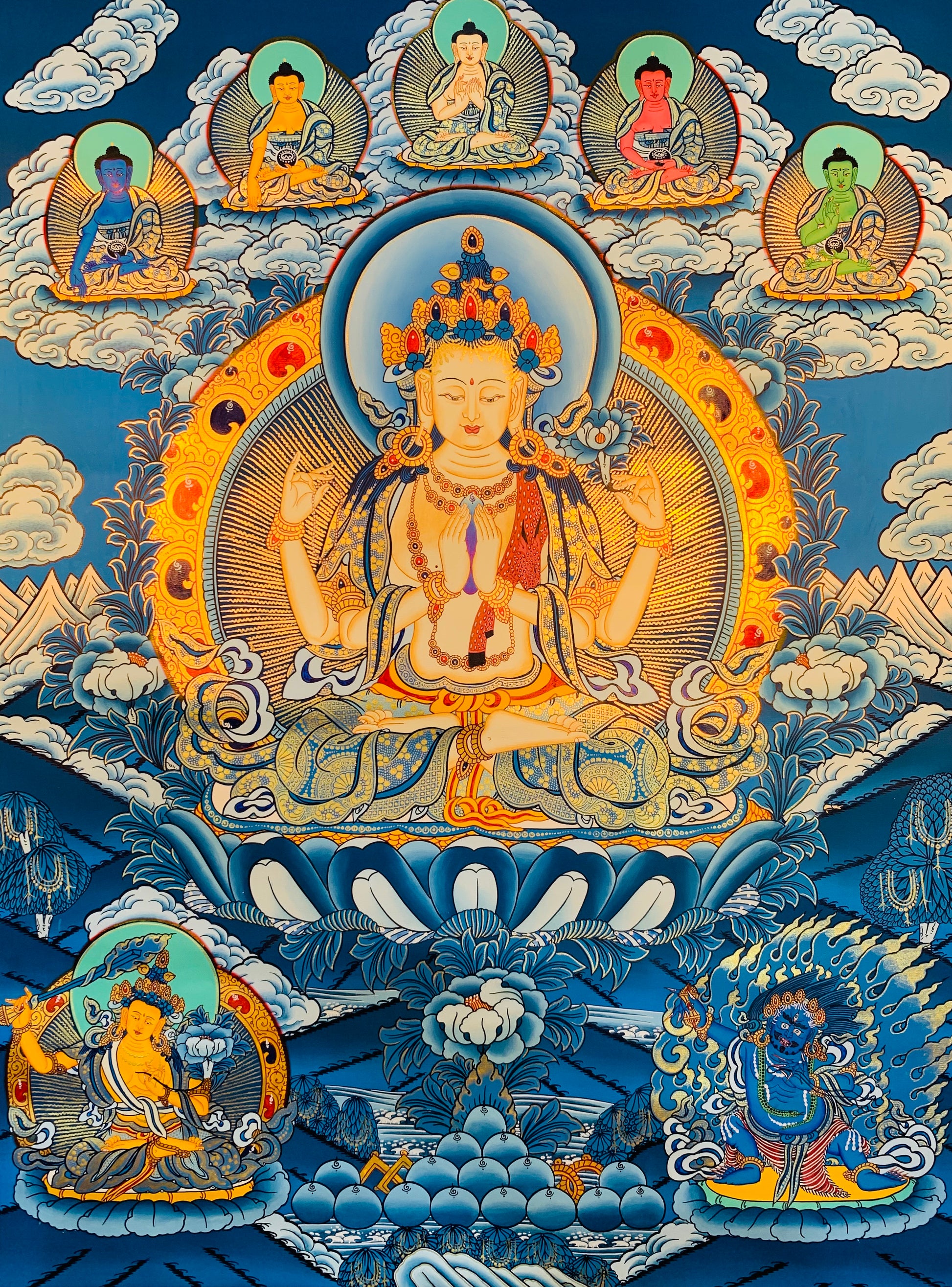 唐卡是在棉布画布上使用天然矿物和植物颜料完全手工绘制的,带有 24K 金细节。复杂的图案、错综复杂的笔触、非凡的细节,使这些唐卡成为真正的佛教艺术作品。 这幅传统佛教画作是真正的杰作,是您家、冥想空间、室内神龛或祭坛空间的完美补充。