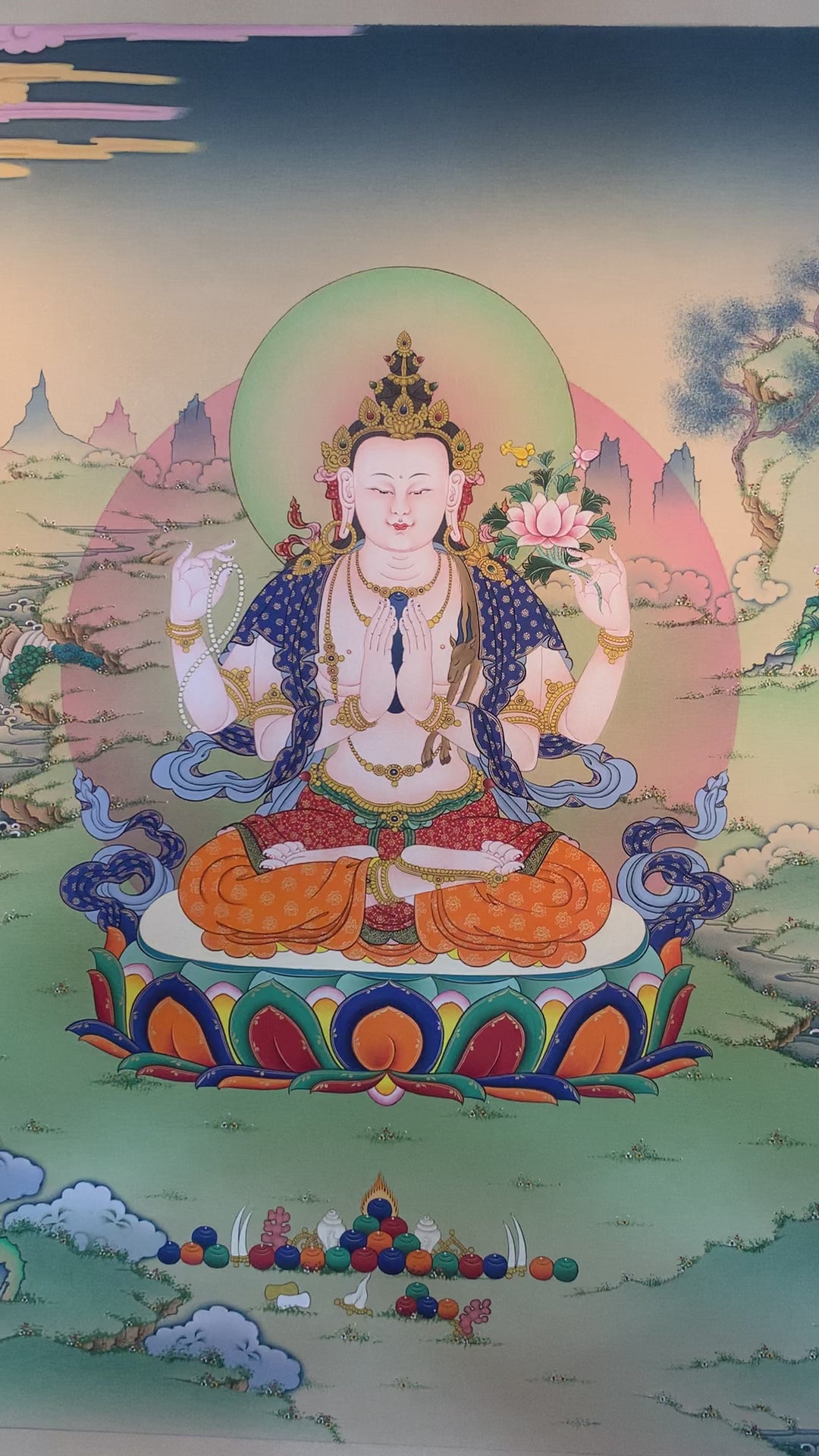 This beautiful hand painted Tibetan thangka painting depicts Chenrezig སྤྱན་རས་གཟིགས་ / Avalokiteshvara - Known as the buddha of compassion and the patron deity of Tibet.