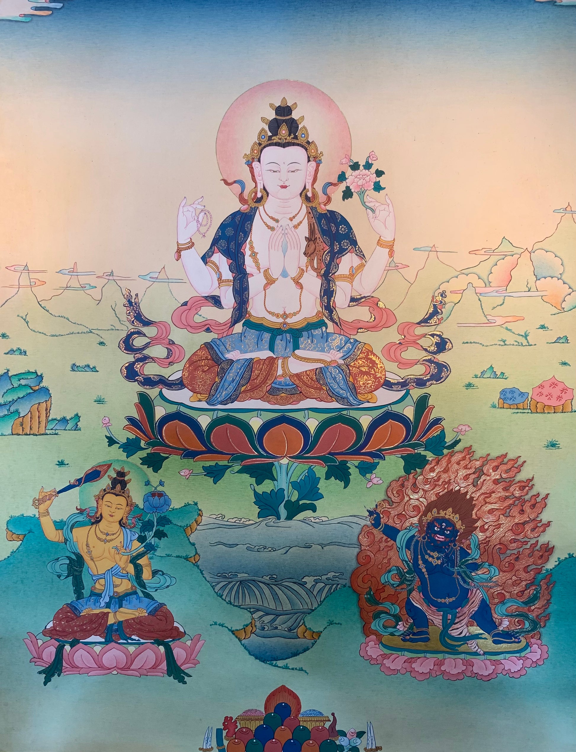 This beautiful hand painted Tibetan thangka painting depicts Avalokiteshvara (also known as Chenrezig སྤྱན་རས་གཟིགས་), the Buddha of compassion.