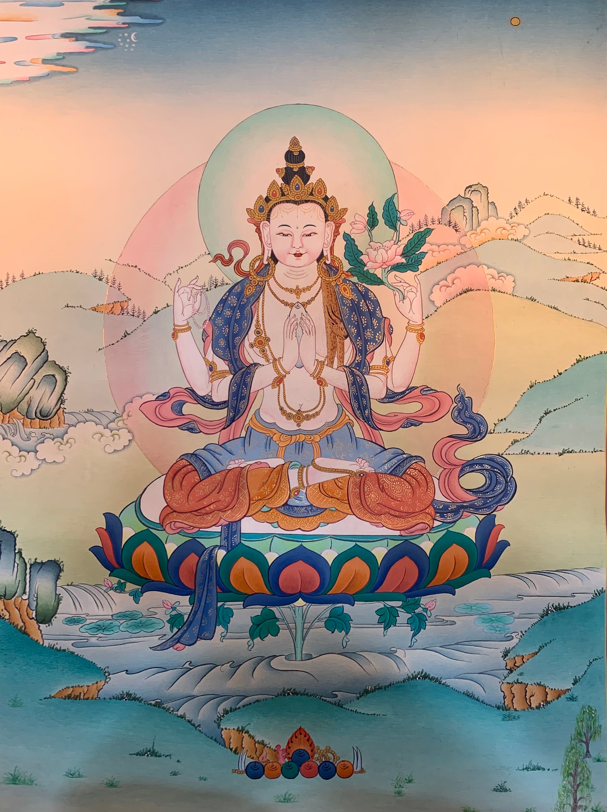 This beautiful hand painted Tibetan thangka painting depicts Avalokiteshvara (also known as Chenrezig སྤྱན་རས་གཟིགས་), the Buddha of compassion.