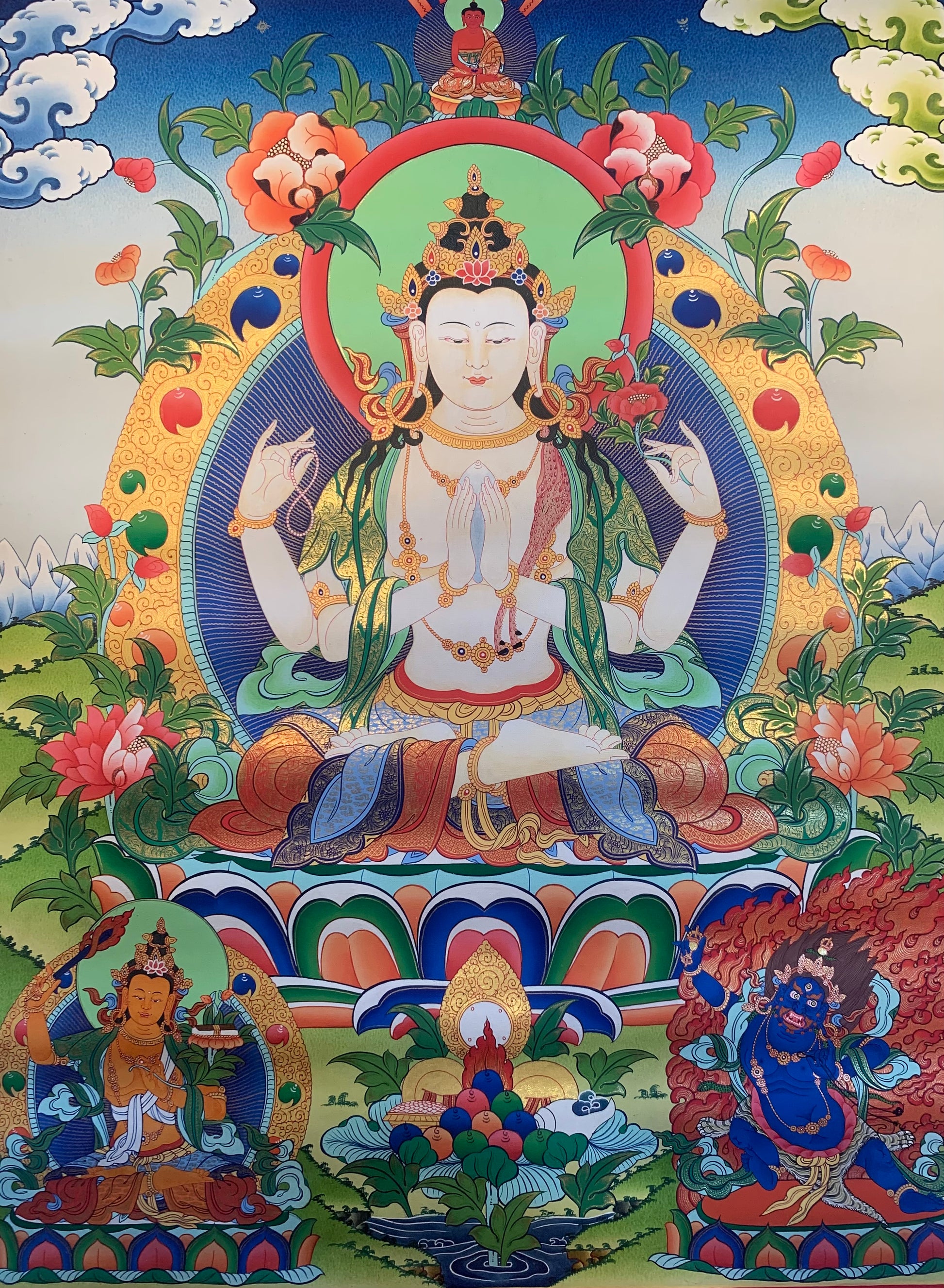 This beautiful hand painted Tibetan thangka painting depicts Chenrezig སྤྱན་རས་གཟིགས་ / Avalokiteshvara - Known as the buddha of compassion and the patron deity of Tibet.