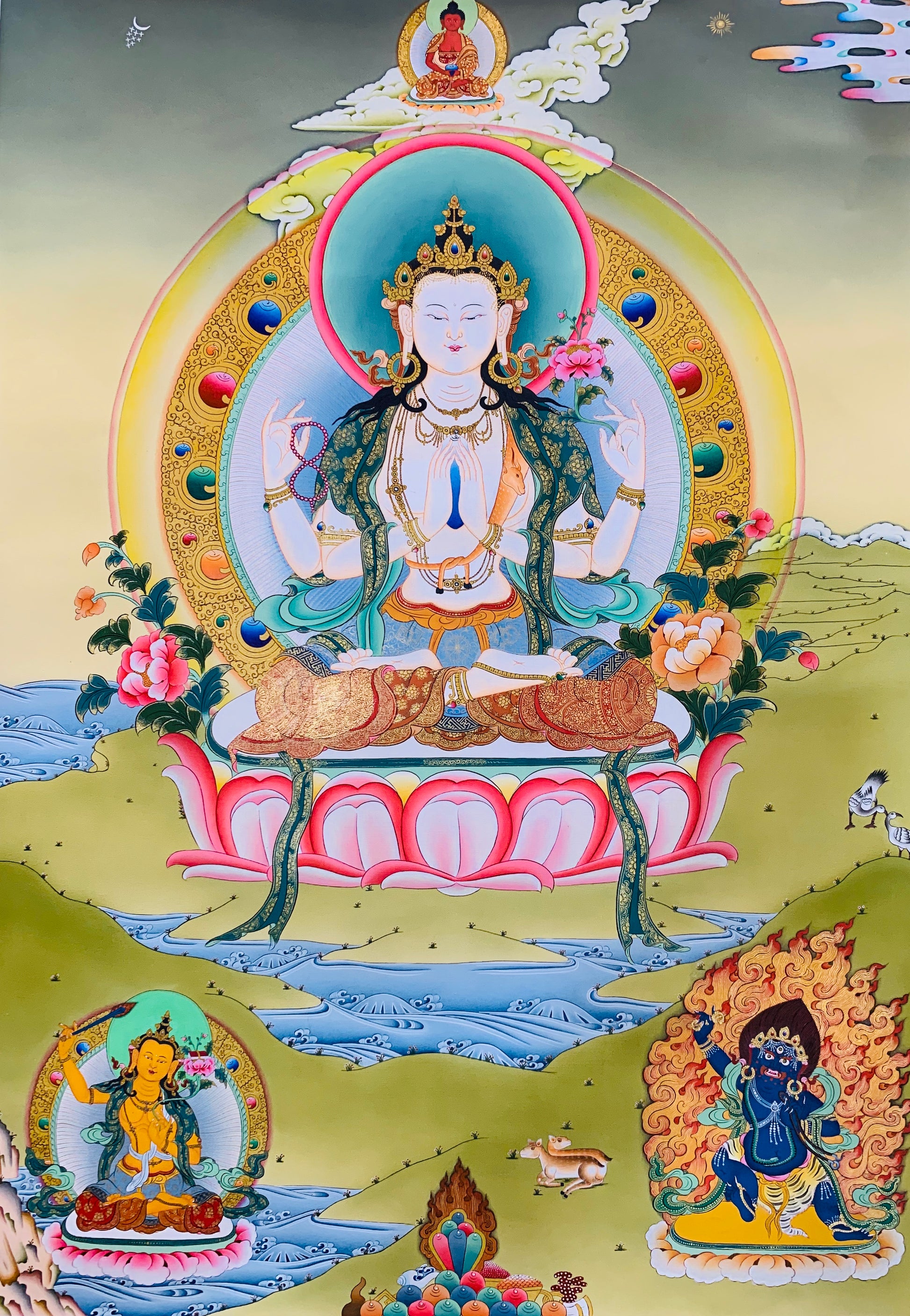 这幅美丽的手绘西藏唐卡画描绘了观世音菩萨(也称为 Chenrezik སྤྱན་རས་གཟིགས་),慈悲佛。