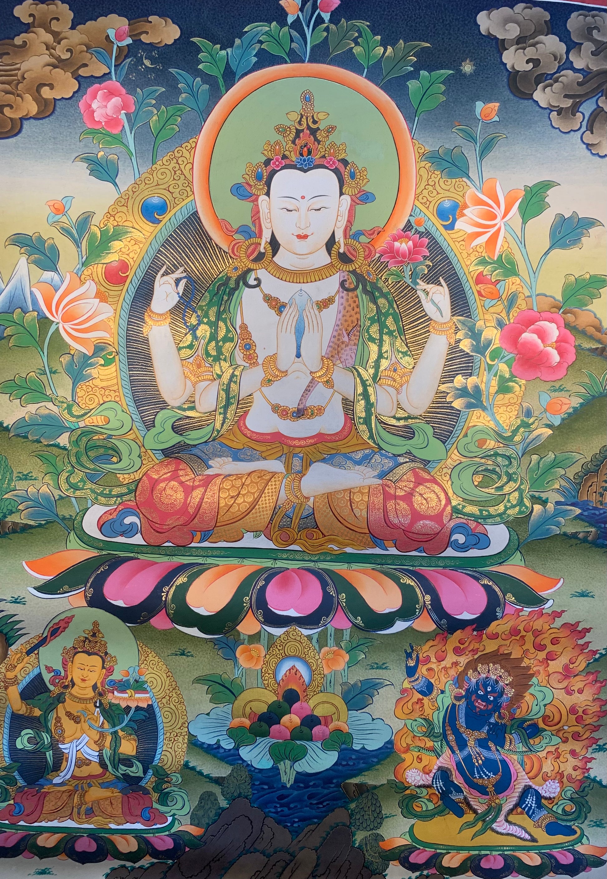 This beautiful hand painted Tibetan thangka painting depicts Avalokiteshvara (also known as Chenrezik སྤྱན་རས་གཟིགས་), the Buddha of compassion.