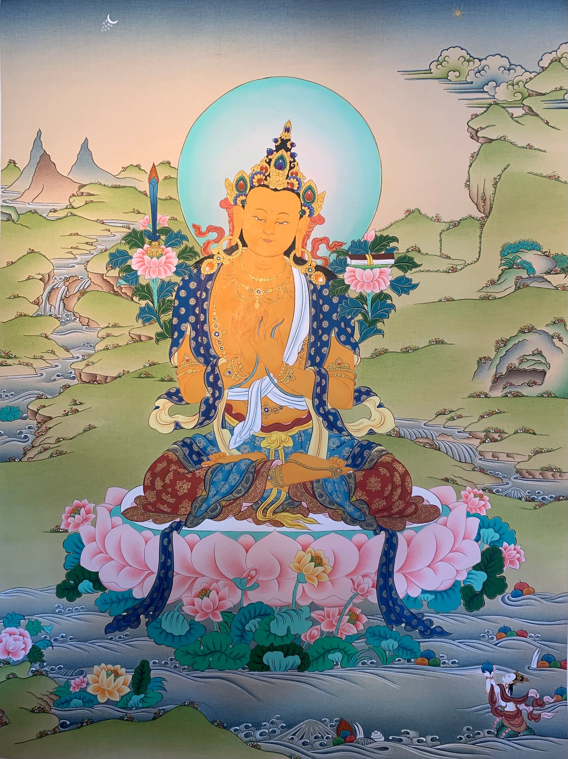 This beautiful hand painted Tibetan thangka painting depicts Mañjushri འཇམ་དཔལ་, also known as Mañjughosha. Mañjushri is the embodiment of the knowledge and wisdom of all the Buddhas. He holds a sword that cuts all ignorance in his right hand and a Prajnaparamita sutra book in the left hand and supported by a flower blossom.