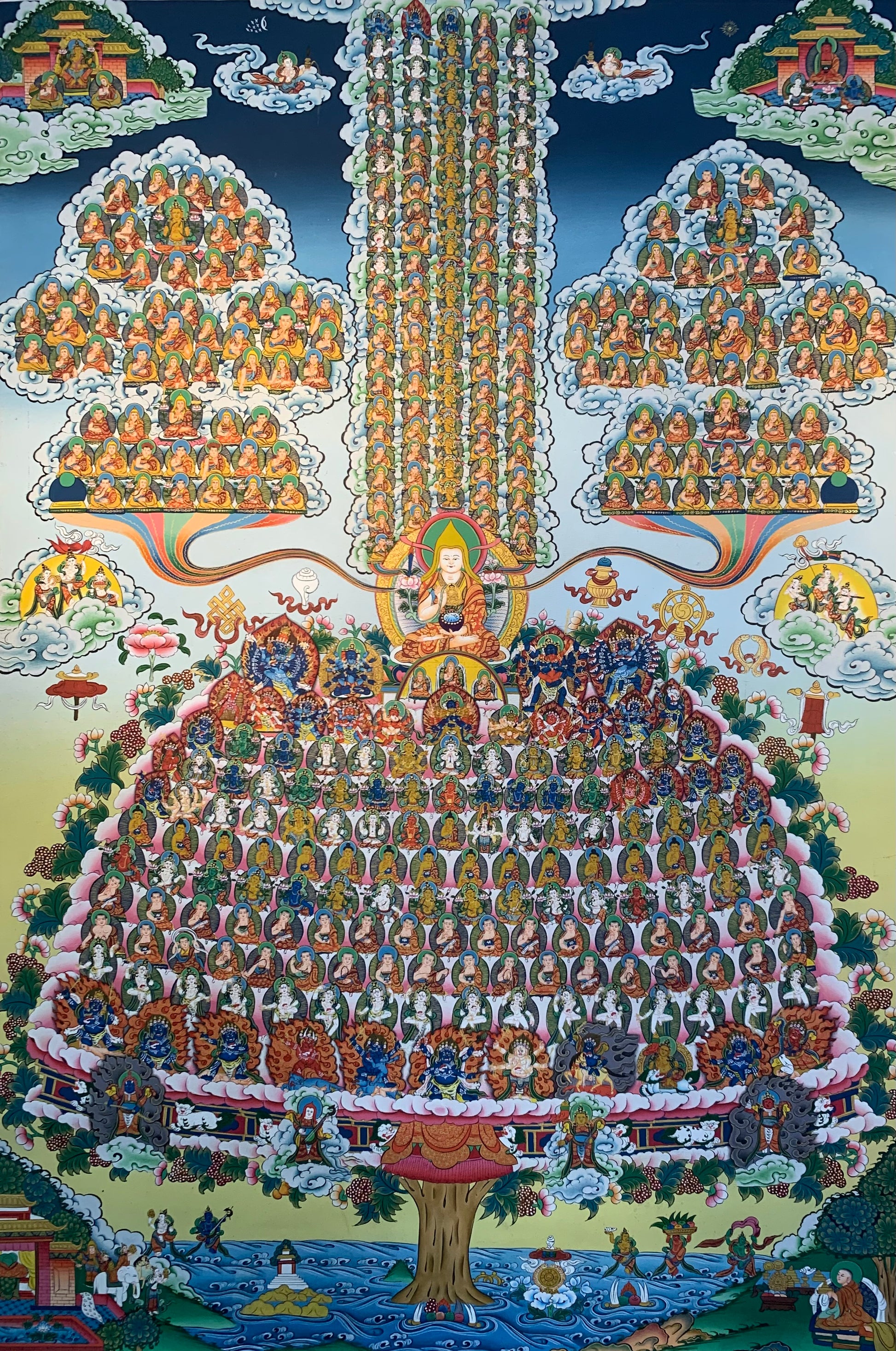 This beautiful hand painted Tibetan thangka depicts Gelug Lineage Refuge Tree.