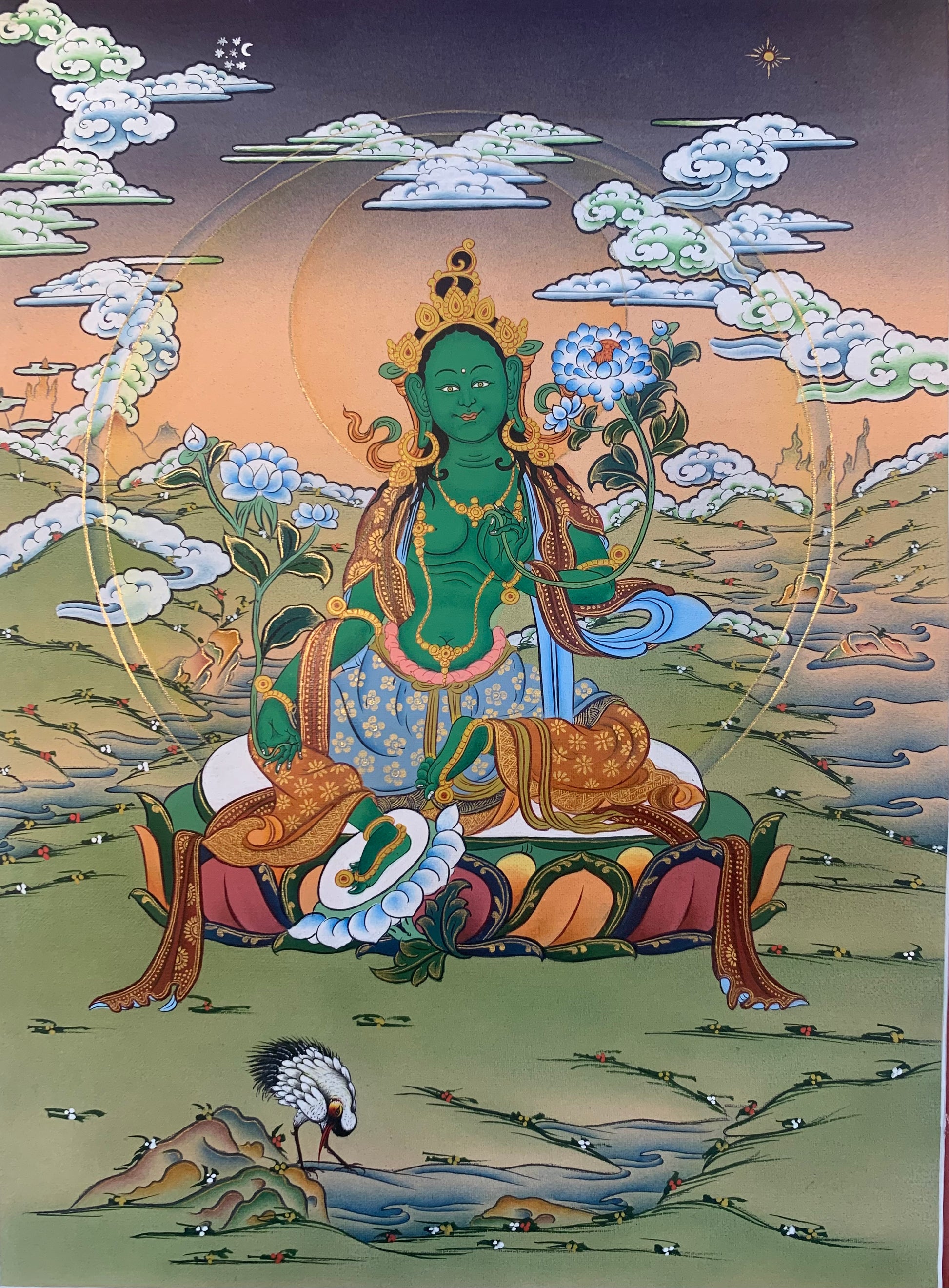 This beautiful hand painted Tibetan thangka painting depicts Green Tara སྒྲོལ་ལྗང་. Green Tara is regarded as the mother of all Bodhisattvas, a lover of all sentient beings. She is associated with enlightened activity, helping people pass beyond earthly existence. Green Tara grants refuge from all things which may obstruct, or cause trouble. She also embodies many qualities of the ‘feminine’, known as the mother of mercy and compassion, giving relief from bad karma.