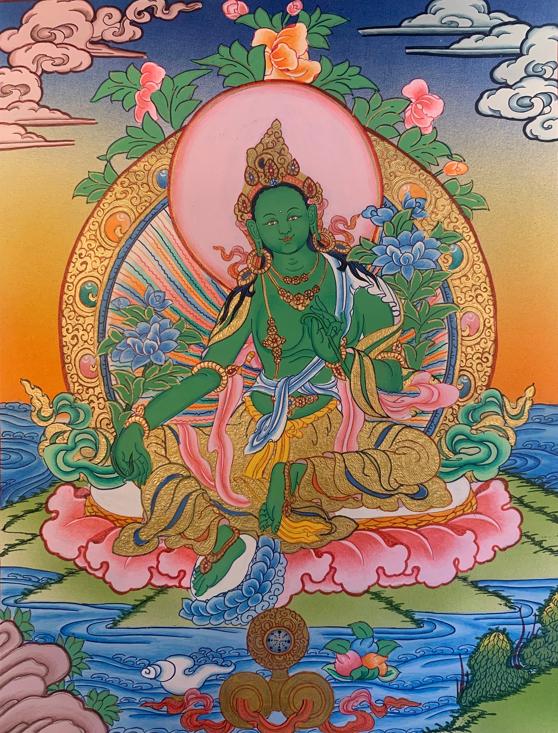This beautiful hand painted Tibetan thangka painting depicts Green Tara སྒྲོལ་ལྗང་. Green Tara is regarded as the mother of all Bodhisattvas, a lover of all sentient beings. She is associated with enlightened activity, helping people pass beyond earthly existence. Green Tara grants refuge from all things which may obstruct, or cause trouble. She also embodies many qualities of the ‘feminine’, known as the mother of mercy and compassion, giving relief from bad karma.