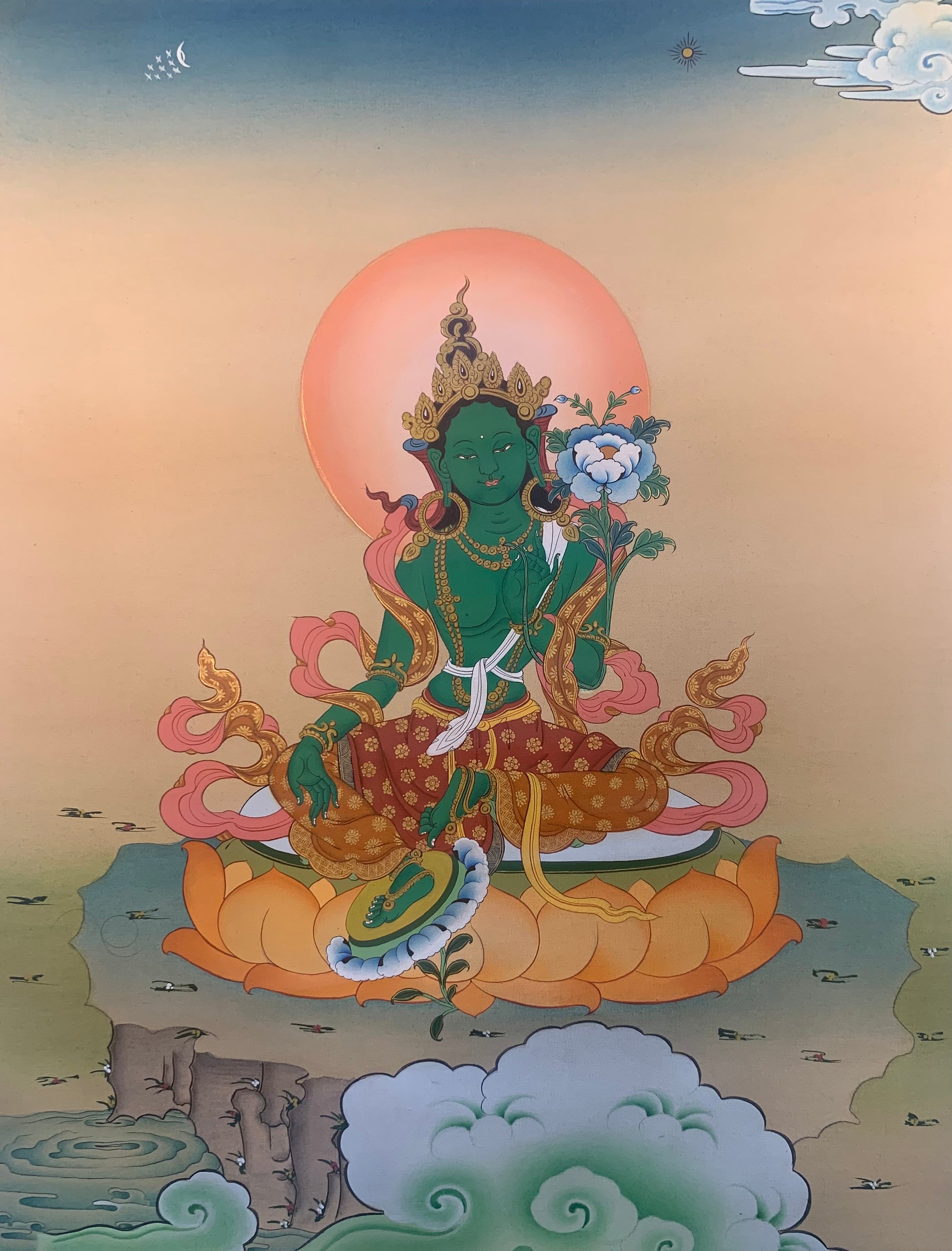 This beautiful hand painted Tibetan thangka painting depicts Green Tara སྒྲོལ་ལྗང་. Green Tara is regarded as the mother of all Bodhisattvas, a lover of all sentient beings. She is associated with enlightened activity, helping people pass beyond earthly existence. Green Tara grants refuge from all things which may obstruct, or cause trouble. She also embodies many qualities of the ‘feminine’, known as the mother of mercy and compassion, giving relief from bad karma.
