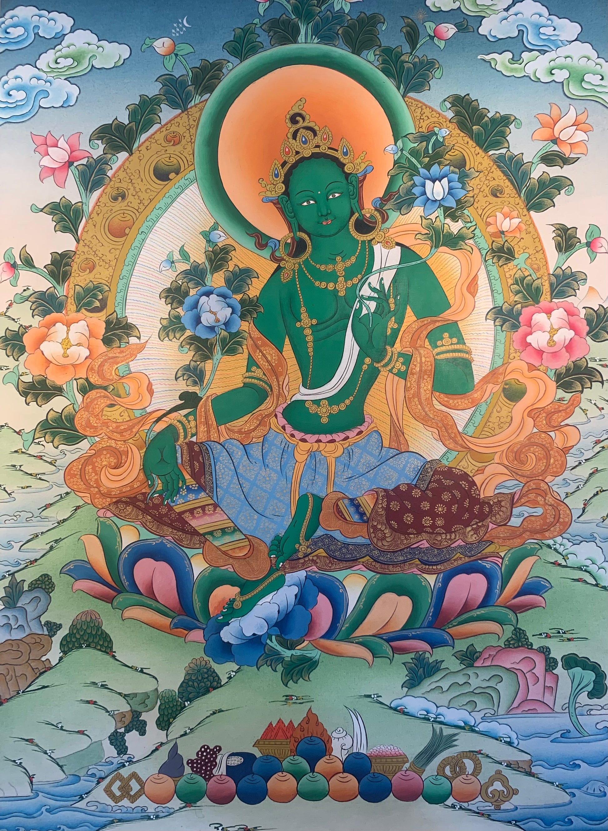 This beautiful hand painted Tibetan thangka painting depicts Green Tara སྒྲོལ་ལྗང་. Green Tara is regarded as the mother of all Bodhisattvas, a lover of all sentient beings. She is associated with enlightened activity, helping people pass beyond earthly existence. Green Tara grants refuge from all things which may obstruct, or cause trouble. She also embodies many qualities of the ‘feminine’, known as the mother of mercy and compassion, giving relief from bad karma.