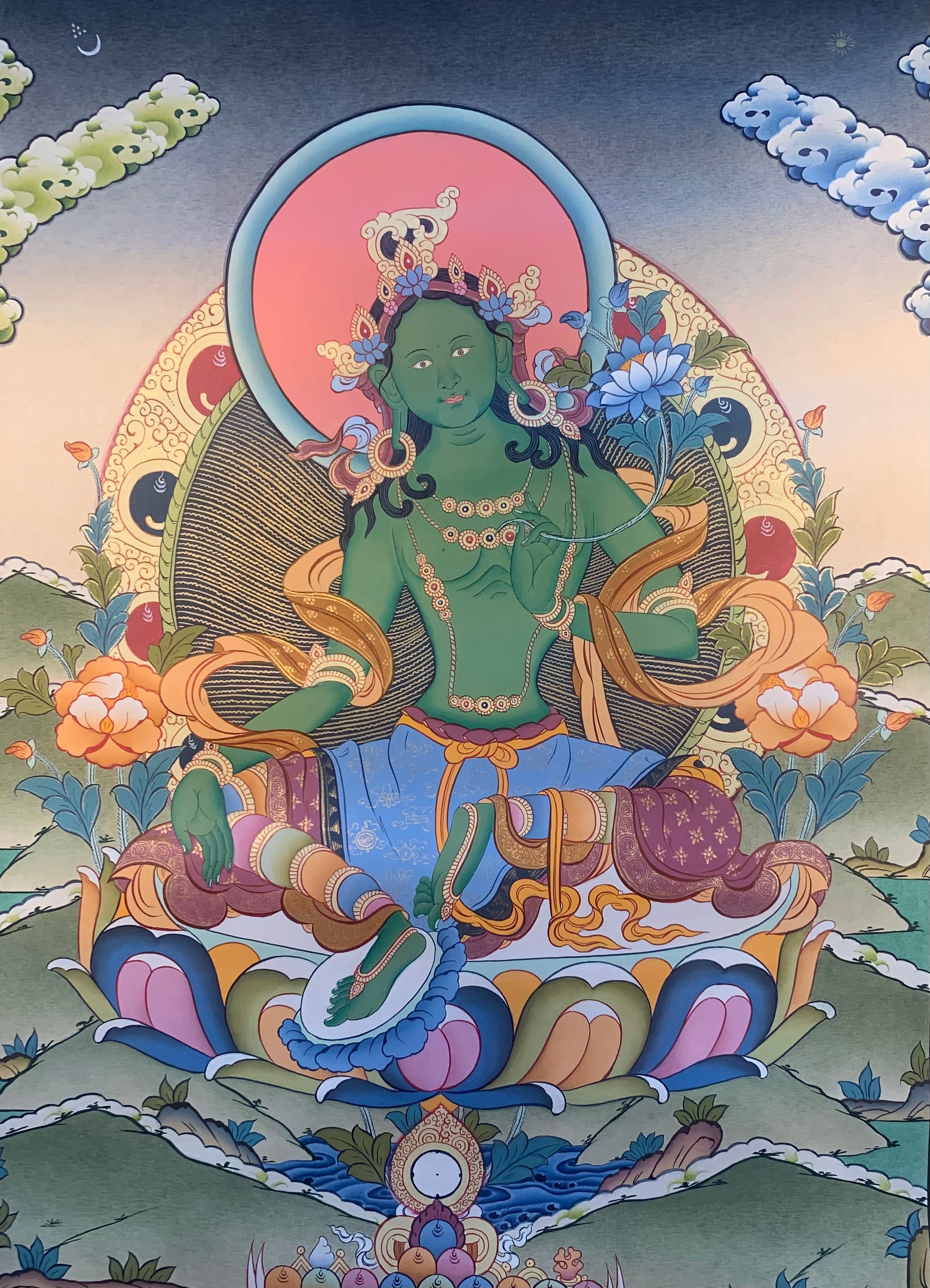 This beautiful hand painted Tibetan thangka painting depicts Green Tara སྒྲོལ་ལྗང་. Green Tara is regarded as the mother of all Bodhisattvas, a lover of all sentient beings. She is associated with enlightened activity, helping people pass beyond earthly existence. Green Tara grants refuge from all things which may obstruct, or cause trouble. She also embodies many qualities of the ‘feminine’, known as the mother of mercy and compassion, giving relief from bad karma.